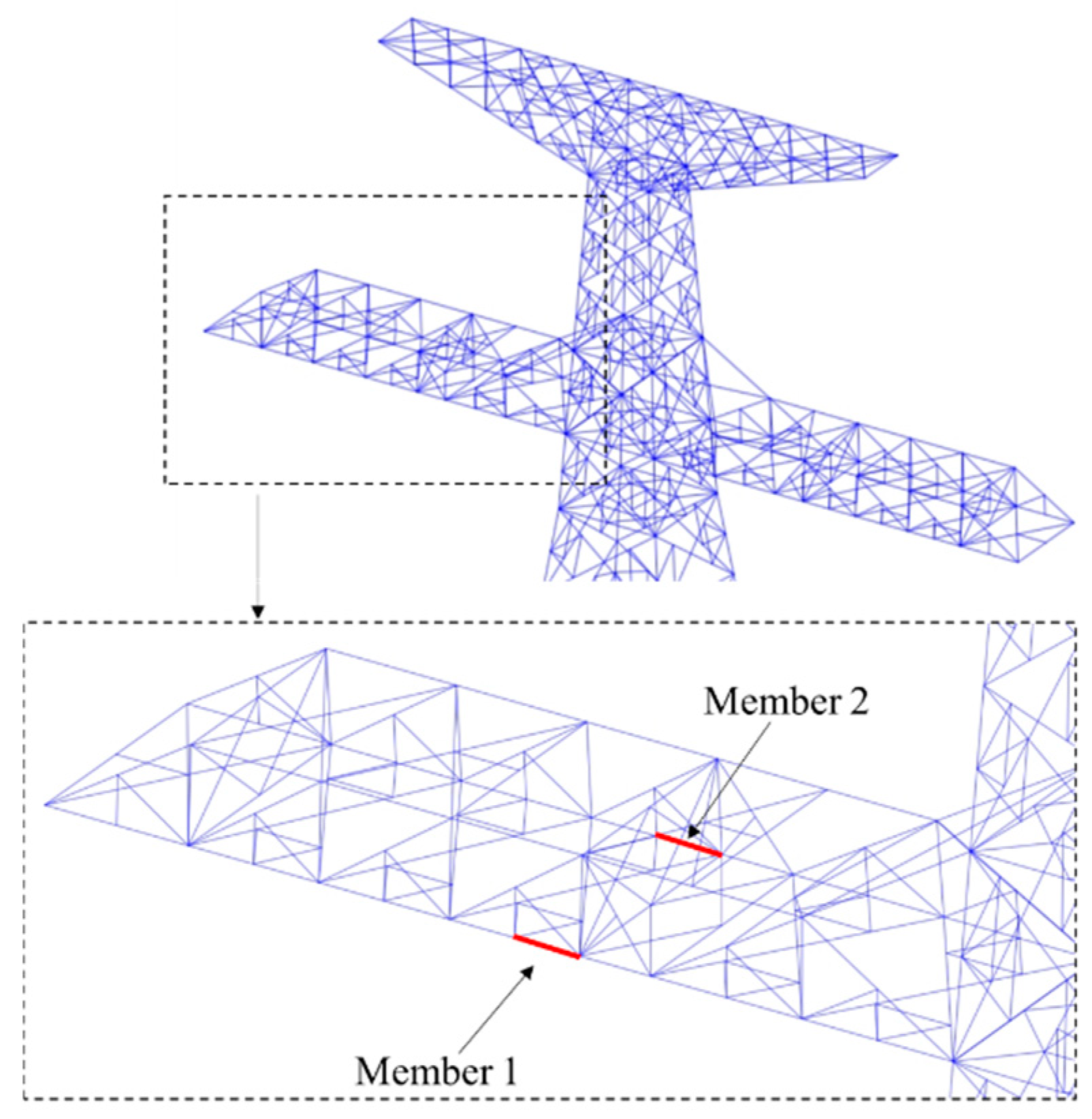 Two members located in the middle of one side of the transmission tower’s cross-arm were selected for stress analysis, with their positions illustrated in
