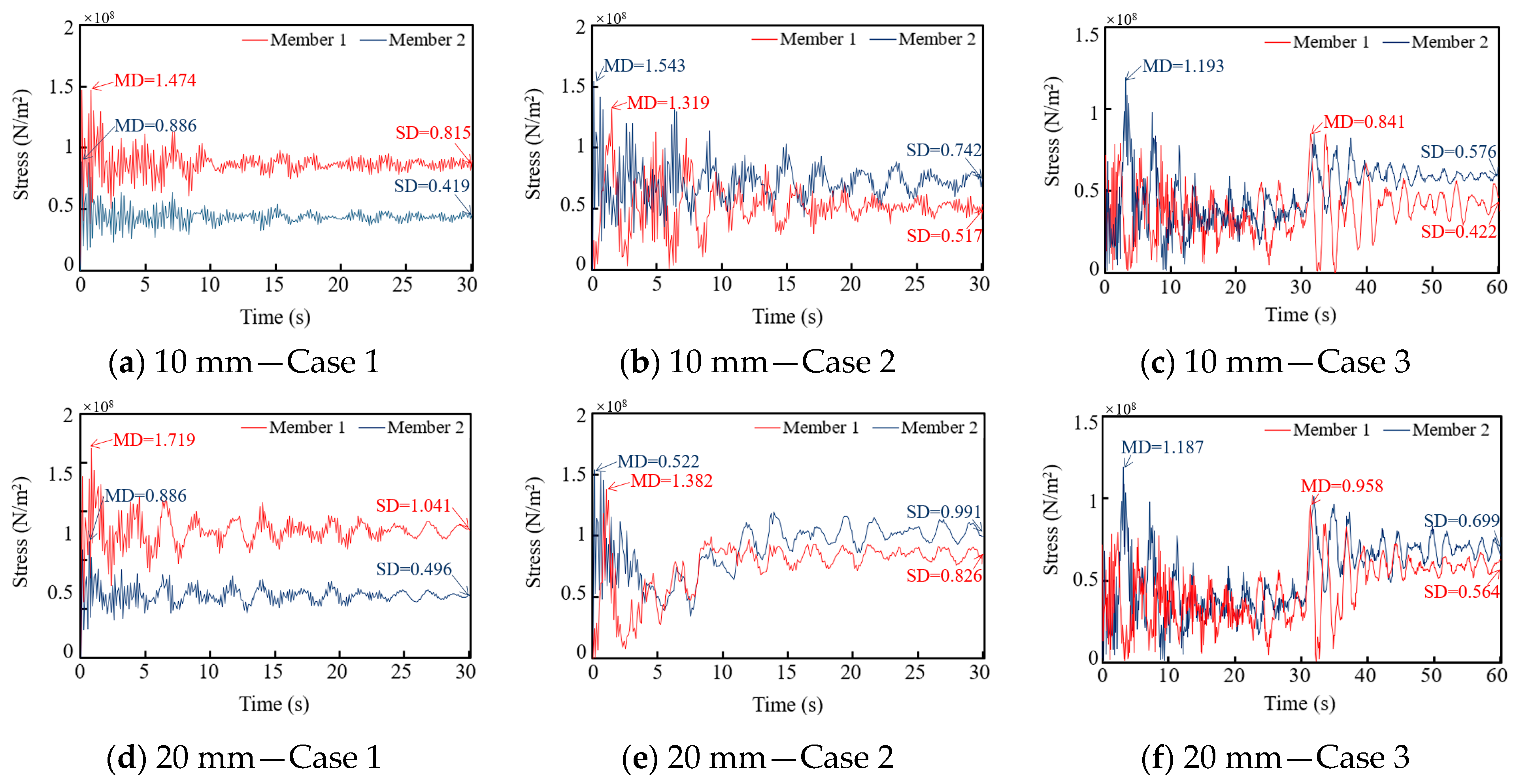 Figure 9 shows the stress-time curves for both members. It can be observed that the stress curves for both members in Case 1 and Case 2 exhibit a damped vibration, characterized by a gradual decrease in amplitude over time, with the stress eventually approaching a stable value. In Case 3, the stress curve demonstrates a two-stage damped response. A distinct transition occurs at the 30-s mark when an additional load is applied, after which the stress gradually decreases again and stabilizes. The steady-state stress values of the members were extracted across all load cases, with the results summarized in