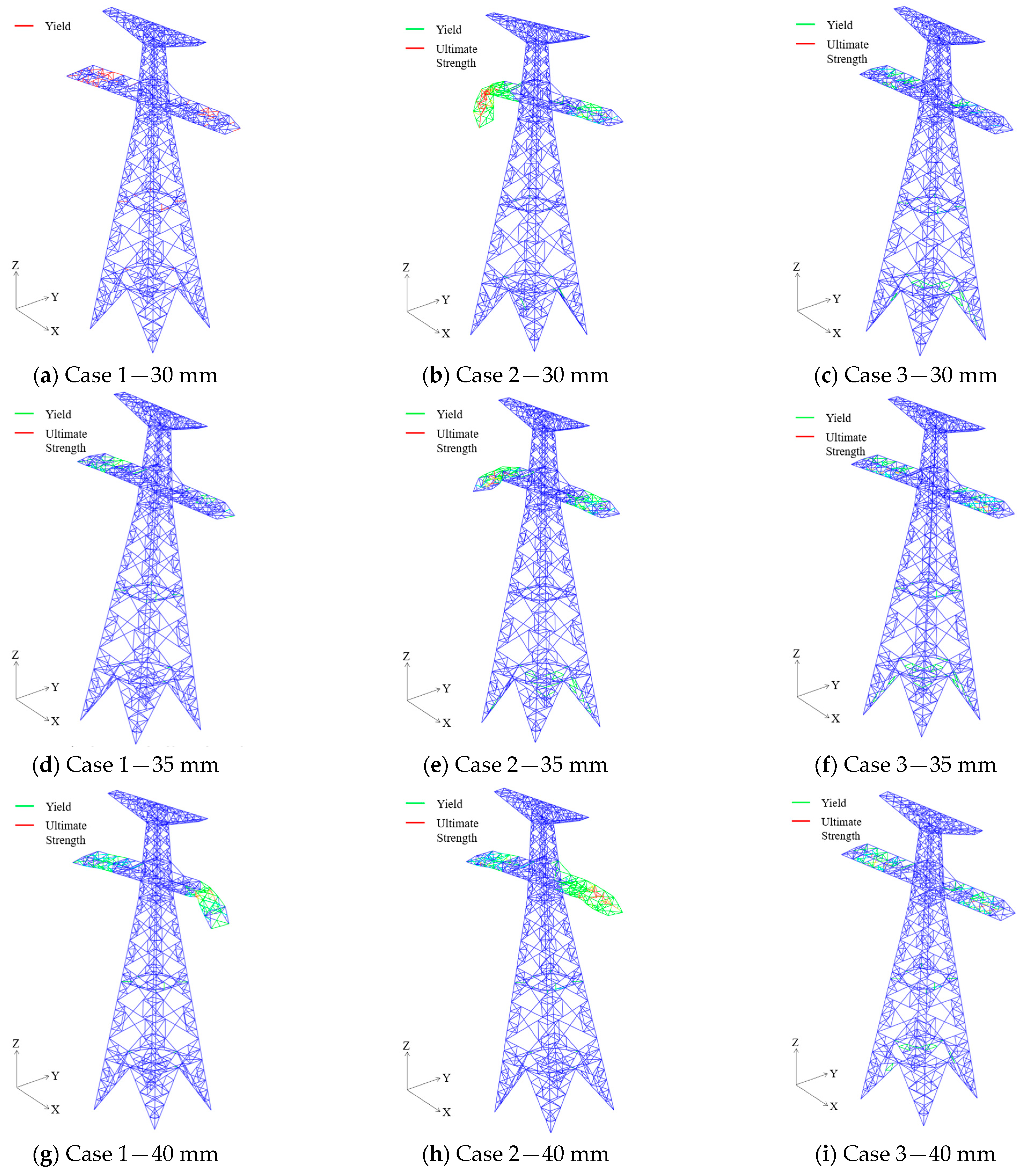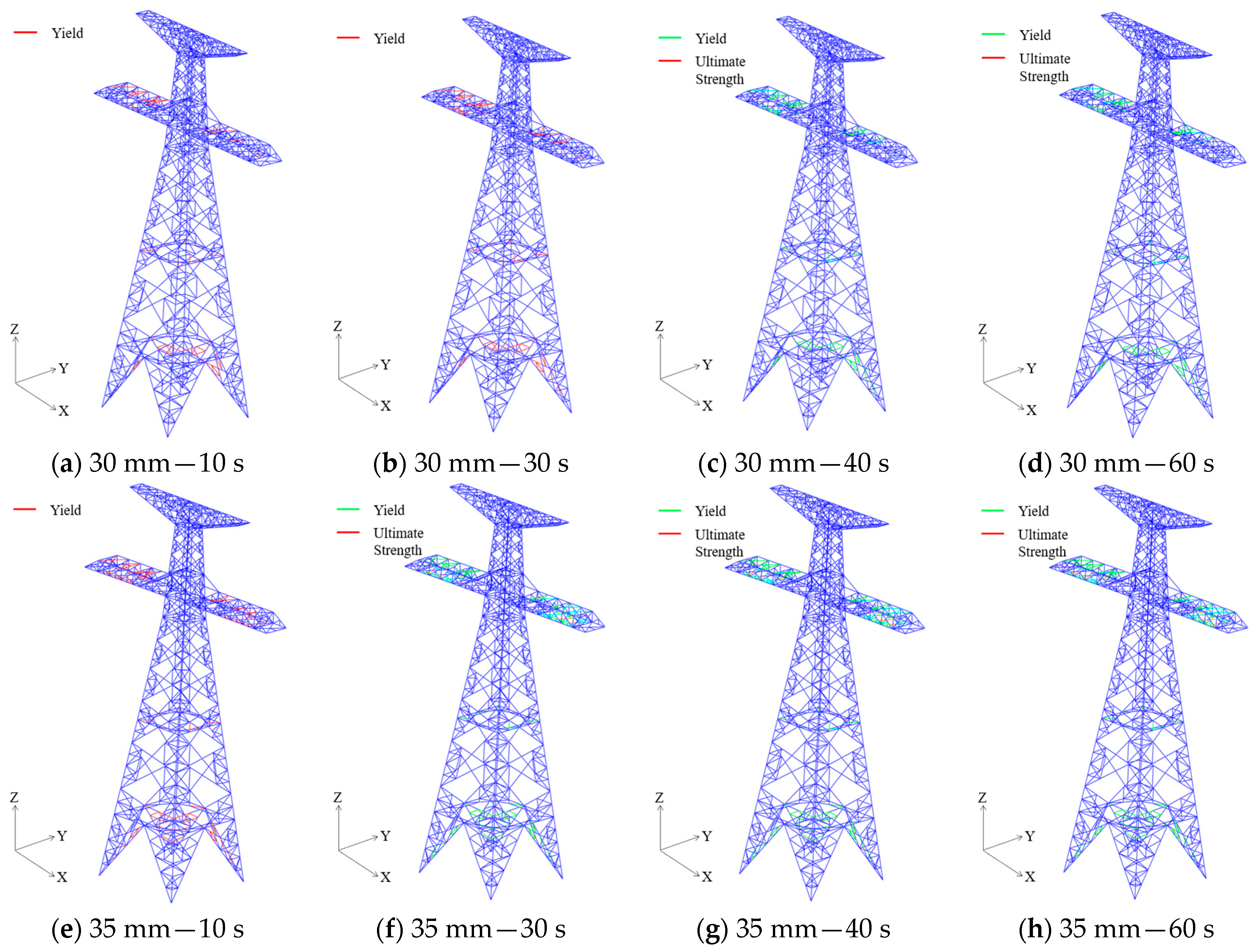 Figure 11 shows the SDV3 contour plots of Case 3 at these four time points under 30 mm and 35 mm ice loads. The results reveal that most of the damage development occurs within the first 10 s. Between 10 s and 30 s, damage progression is minimal. Although an additional ice load is applied at 30 s, only limited damage evolution is observed between 30 s and 40 s, with only a few additional members yielding or reaching ultimate strength. From 40 s to 60 s, the damage development essentially ceases, and the structure gradually stabilizes. For instance, under the 35 mm ice load, several cross-arm members had already yielded within the first 10 s. By 30 s, some of these members reached the ultimate strength, though the number of yielded members increased only slightly compared to that at 10 s. By 40 s, damage had progressed further, with additional members reaching yield and ultimate strength. However, by 60 s, the set of members that had yielded or reached ultimate strength remained unchanged from that at 40 s, indicating that damage progression had effectively stopped.