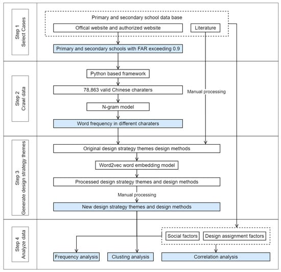 This study employs textual big data and mixed methods research approach that combines both qualitative and quantitative methods. Compared to traditional methods such as questionnaires and diagnostic interviews, collecting and analyzing data from big data and internet text is more efficient []. It also overcomes the issues of small sample sizes, limited time frames, incomplete coverage, and subjective data typical of traditional research methods []. In recent years, textual big data analysis methods have gained prominence in architecture-related fields [,,,,]. To achieve the objectives of this study, the following four steps were carried out, as shown in Figure 1.