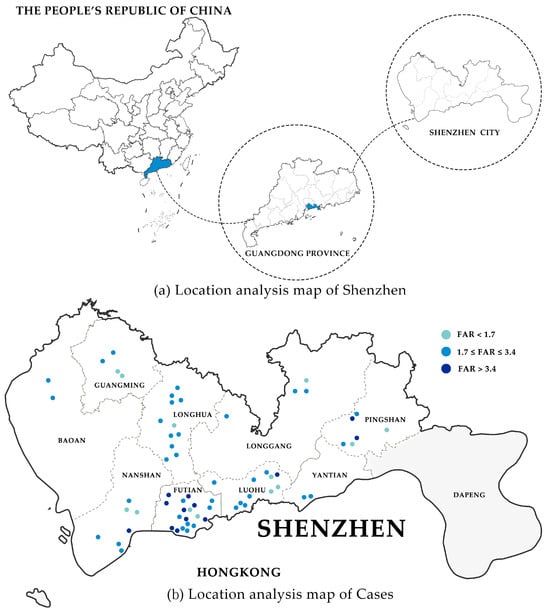 Step 1: Select case. Figure 2a shows the location of Shenzhen in China, and Figure 2b shows the 67 cases selected for this study with a FAR exceeding 0.9 and construction dates after 2012, representing the majority of Shenzhen cases with detailed design descriptions currently available. These sources included official design websites, public accounts, and articles by the design teams. The design statements were prepared by project teams during the design and construction process and released through authoritative platforms, directly reflecting the core intentions and strategies, thereby serving as reliable textual evidence of current design trends in high-FAR school projects. Descriptions from authorized websites (e.g., Gooood, ArchDaily), which compile information from designer interviews and official sources, were also included, thereby enhancing the credibility of the data. Additionally, research cases included schools from most of Shenzhen’s administrative districts (Futian, Guangming, Longgang, Longhua, Luohu, Nanshan, Bao’an, Pingshan, Yantian). Since the case analysis relies on detailed descriptions of schools, Dapeng District, which has the lowest population density in Shenzhen, has very few schools with a FAR over 0.9. Therefore, no detailed design descriptions of high-FAR schools were obtained, and the district was excluded.