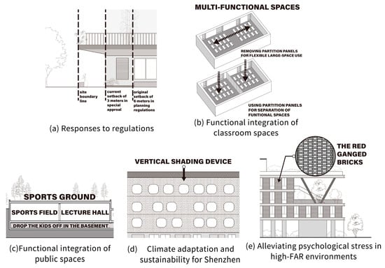 As shown in Table 2, five design strategy themes and eighteen design methods are frequently employed by architects to address high-FAR challenges, based on the textual data analysis. These five include: responses to regulations; functional integration of classroom spaces; functional integration of public spaces; climate adaptation and sustainability for Shenzhen; alleviating psychological stress in high-FAR environments.