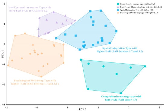 - Data analysis 3 conducted a clustering analysis on current high-FAR primary and secondary school cases in Shenzhen. The 67 collected cases were analyzed using the K-means clustering method, with the frequency of design strategies and the FAR as quantitative variables. The high-dimensional features were reduced to a two-dimensional space using Principal Component Analysis (PCA) for visualization. PCA1 and PCA2 represent the primary and secondary directions of variance, respectively, and are used in the plot to illustrate the distribution characteristics of different clusters, resulting in four distinct groupings.