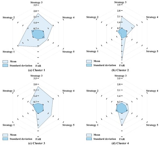 Cluster 1: Comprehensive strategy type with high-FAR. As illustrated in Figure 6a, this cluster accounts for 11.94% of the cases, with FAR primarily ranging from 0.9 to 1.6. Projects in this group demonstrate balanced adoption of all five strategies, with a particularly strong emphasis on Strategy 1 (responses to regulations), representing a comprehensive and regulation-conscious design approach.