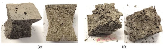 Fracture surfaces of mortar prisms after flexural and compressive testing (242 days): (a) R1—reference; (b) R2—spruce; (c) R3—oak; (d) R4—beech; (e) R5—OSB; (f) R6—spruce shavings.