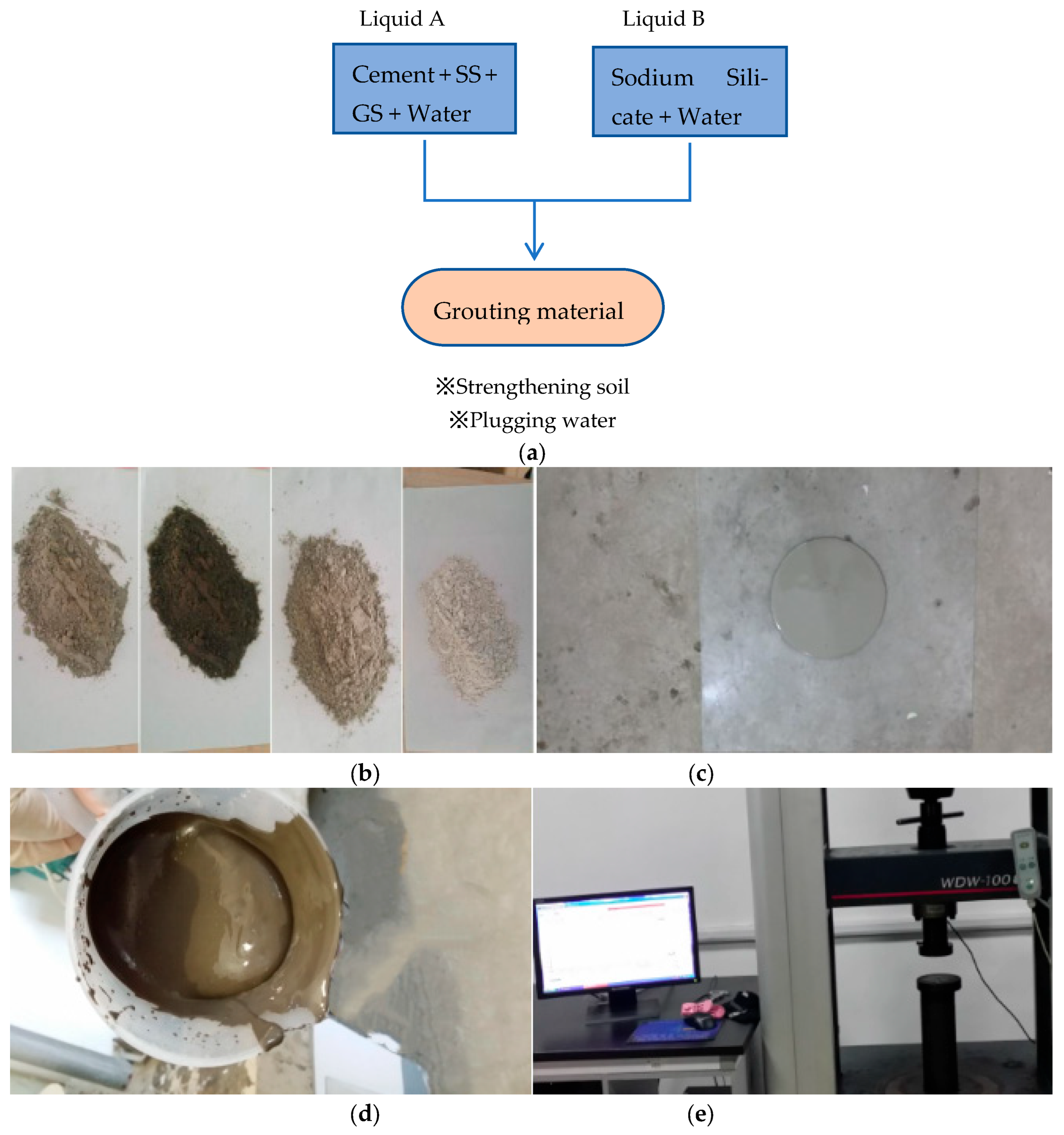 - Li, M.; Huang, G.; Cui, Y.; Wang, B.; Chang, B.; Yin, Q.; Zhang, S.; Wang, Q.; Feng, J.; Ge, M. Coagulation mechanism and compressive strength characteristics analysis of high-strength alkali-activated slag grouting material. Polymers 2022, 14, 3980. [Google Scholar] [CrossRef] [PubMed]