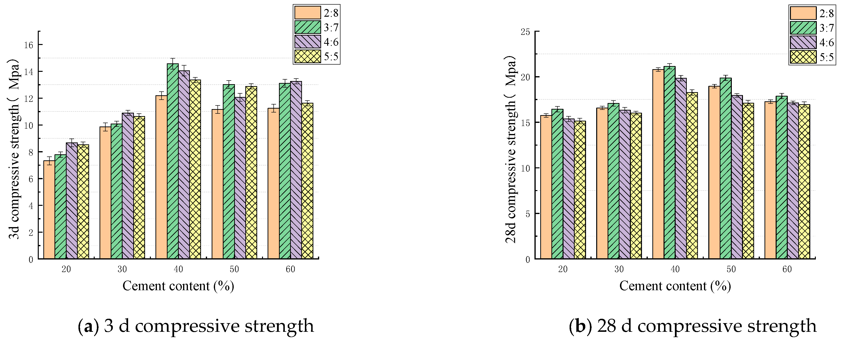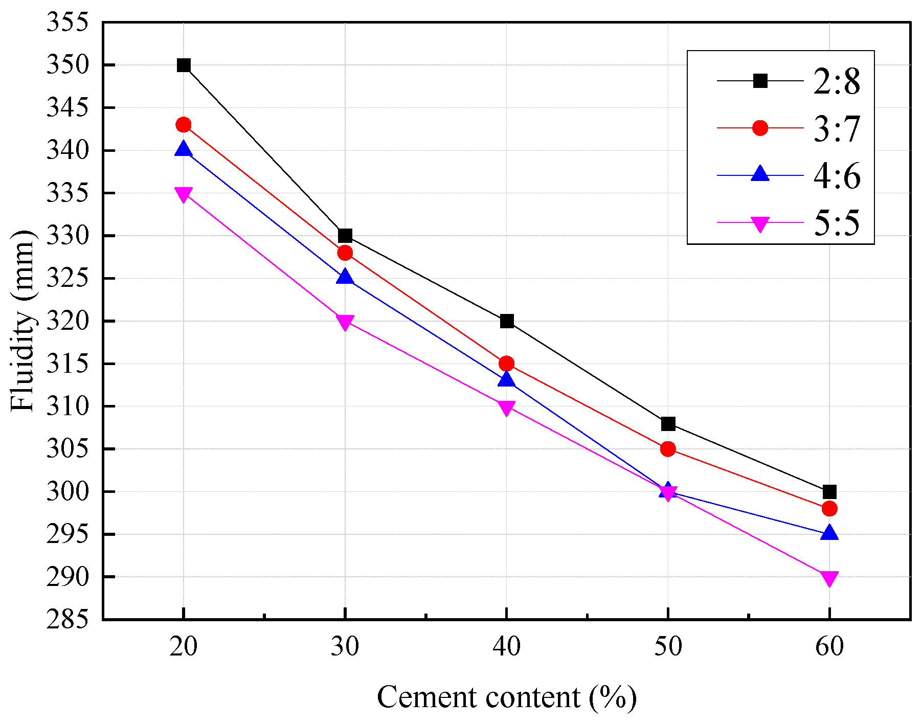| Sample | C % | SS % | FA % | SL % | Fluidity mm | Gel Time s | Concretion Rate % | 3 d Compressive Strength MPa | 28 d Compressive Strength MPa |