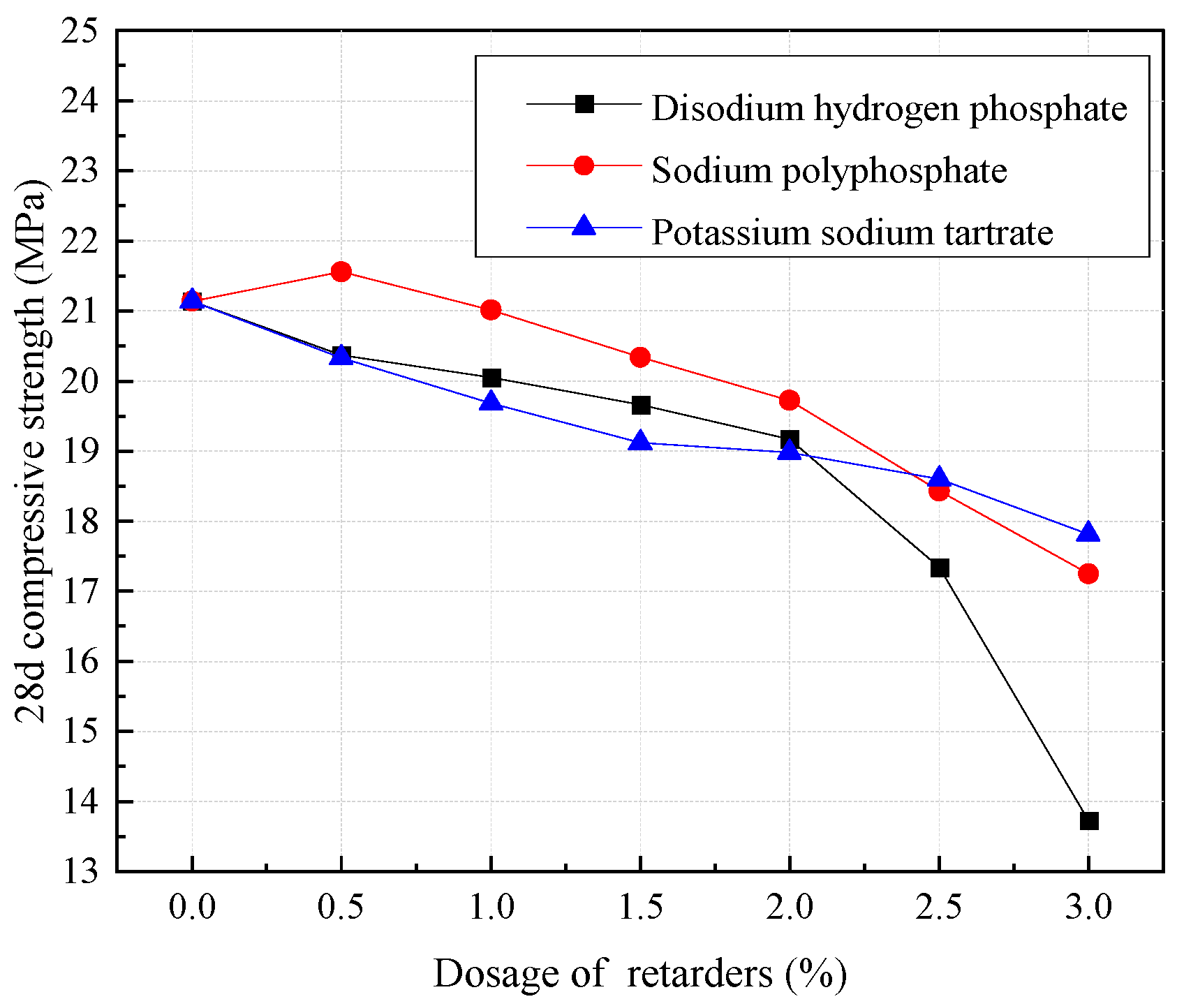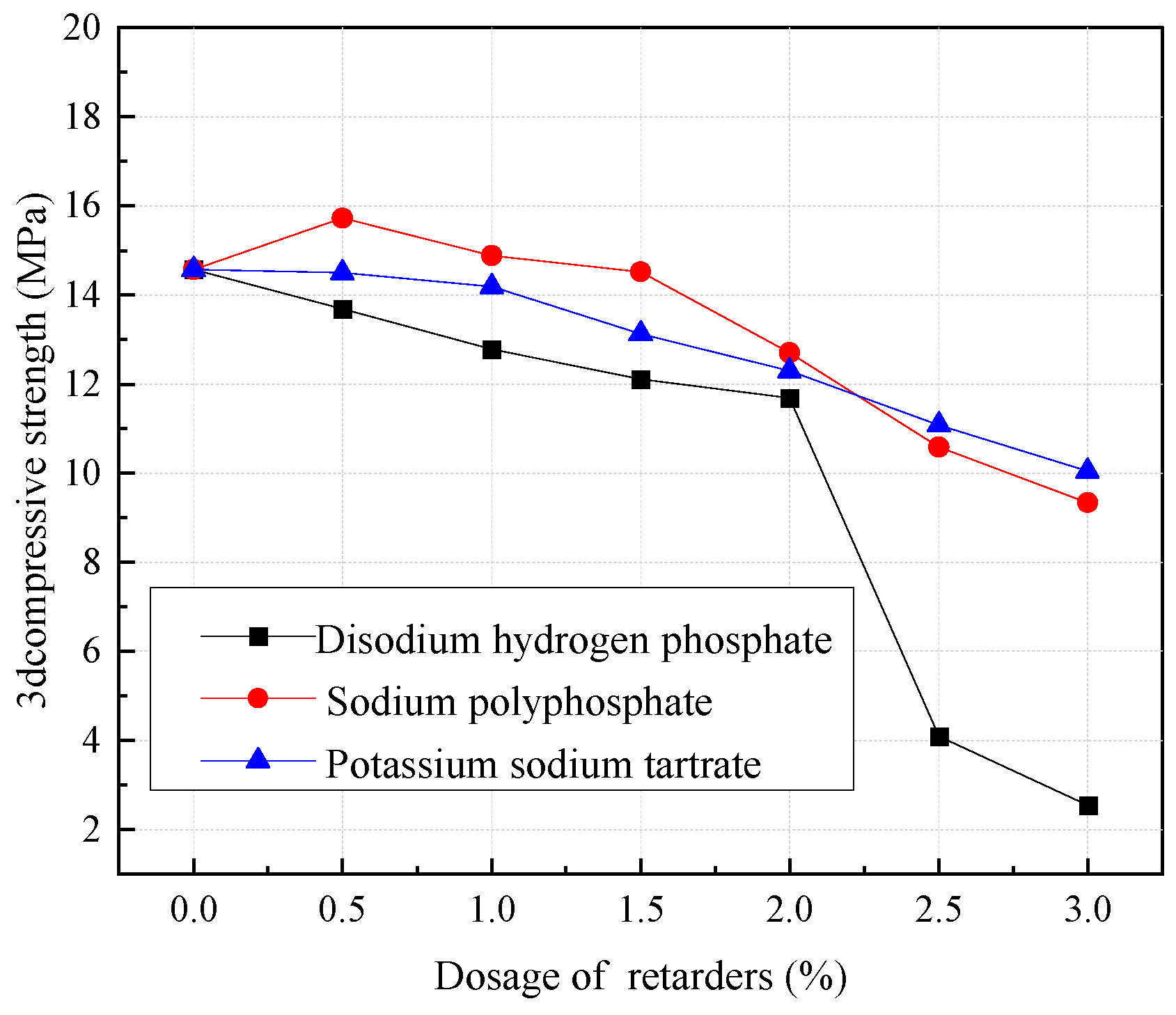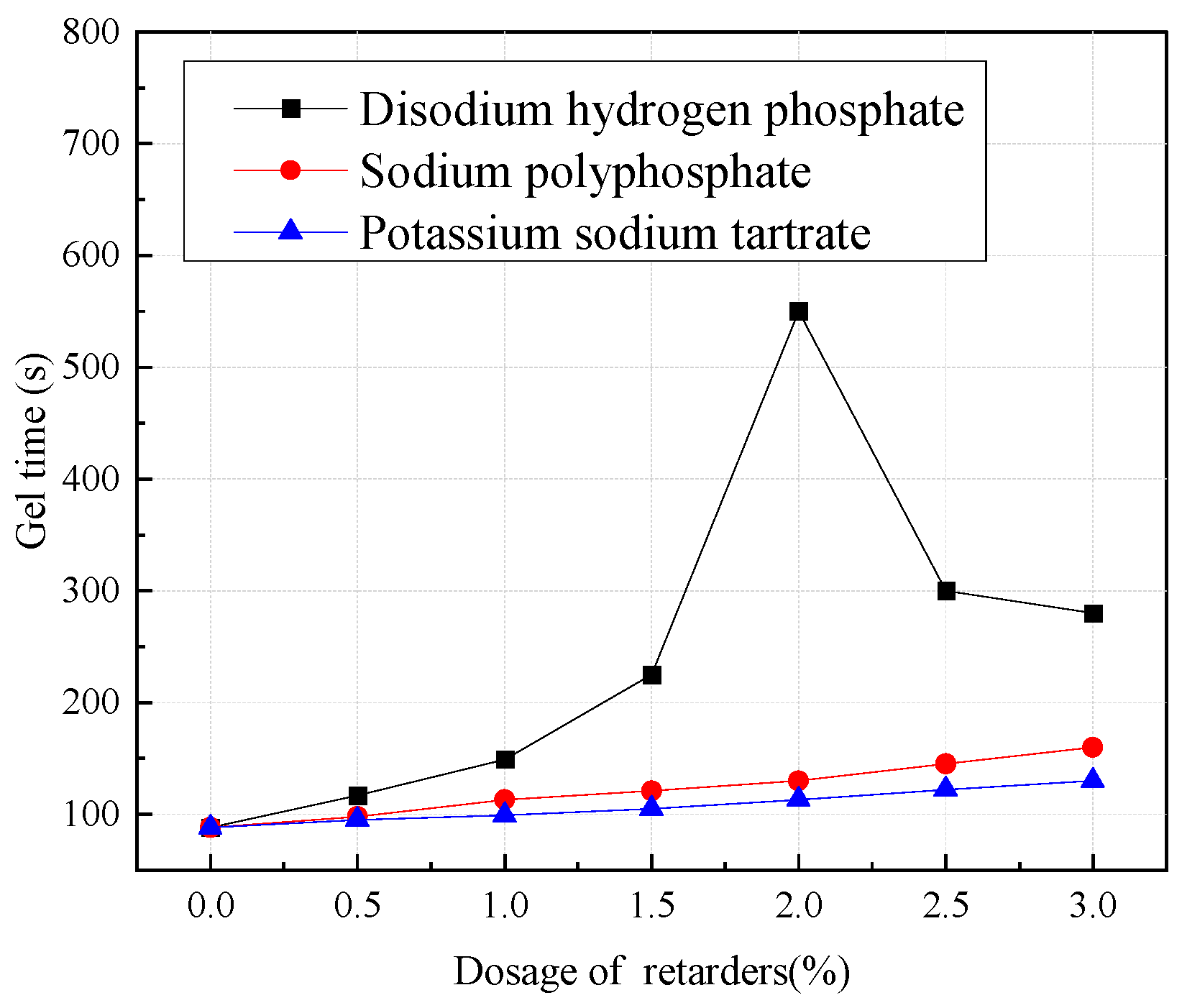 - Compared with NaO18P6 and C4H4KNaO6, Na2HPO4 has the best retarding effect. When the dosage of disodium phosphate is less than 2%, the gel time is prolonged with increasing disodium phosphate dosage, and the rate of decrease in the compressive strength is only slightly affected.