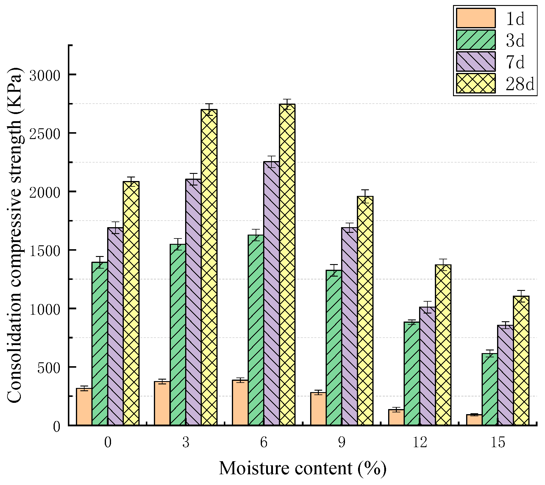 4.2. Effect of the Water Content of Sandy Soil on the Strength of Sandy Soil Consolidation