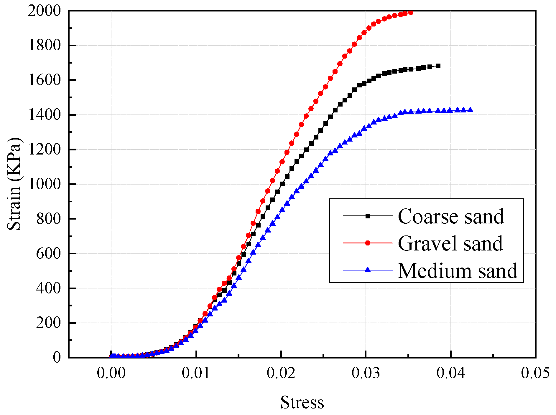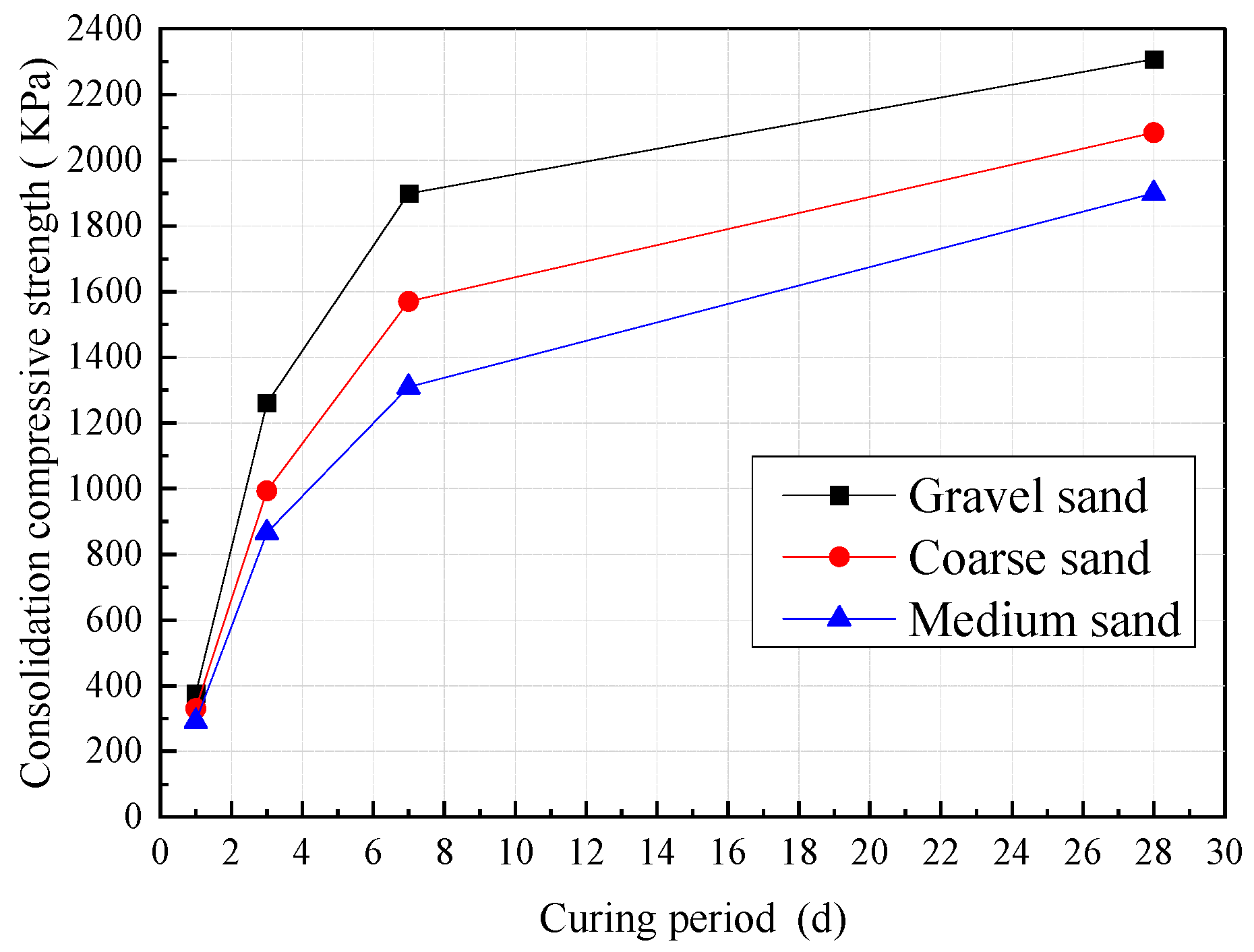 4.3. Effect of the Grain Gradation of Sand in Sandy Soil on the Strength of Sandy Soil Consolidation