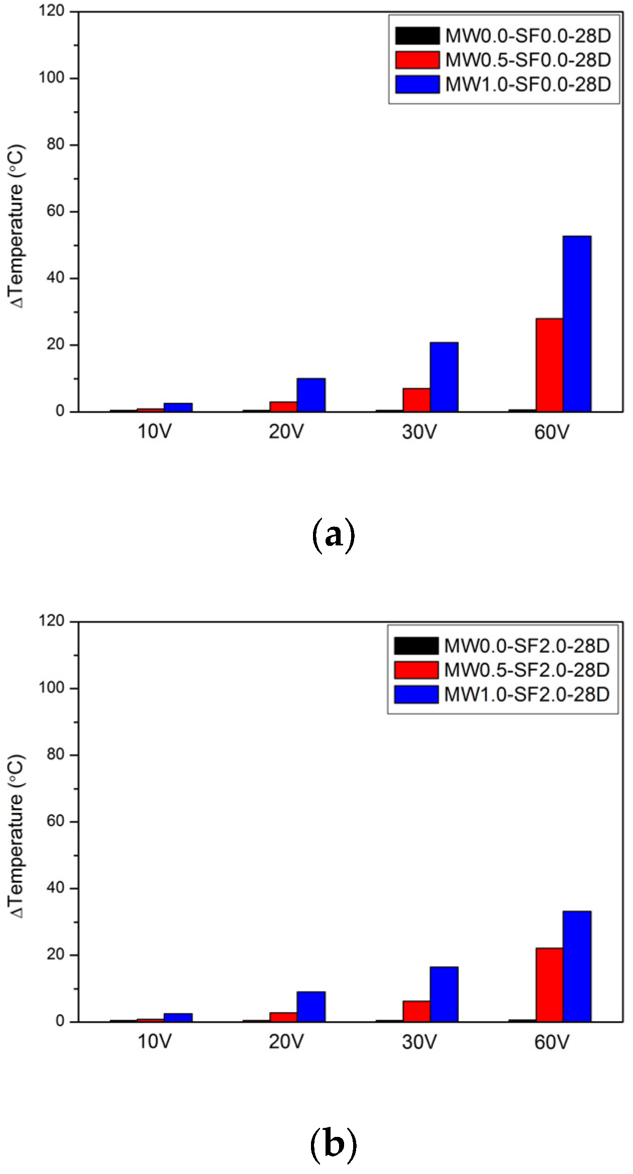 - The heating performance of steel fiber–carbon nano cementitious composites increased with higher MWCNT concentration. Specimen MW1.0-SF0.0-7D exhibited the best heating performance among all parameters, with a 10 min temperature rise of 65.0 °C and a maximum heating value of 80.1 °C. MWCNTs formed CNT networks between the hydration products. As the MWCNT concentration increased, the number of CNT networks also increased, resulting in improved 10 min temperature rise and maximum heating values.
