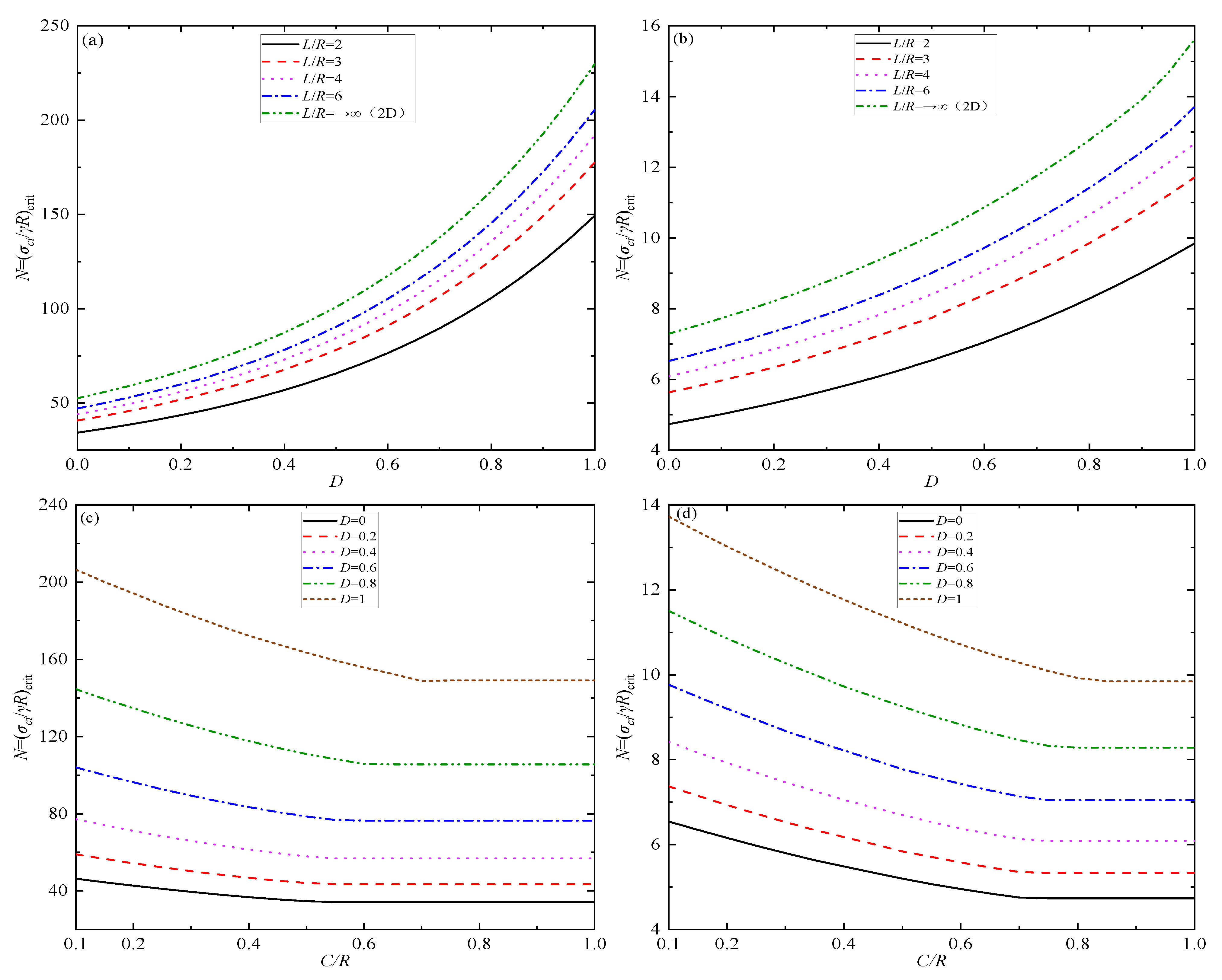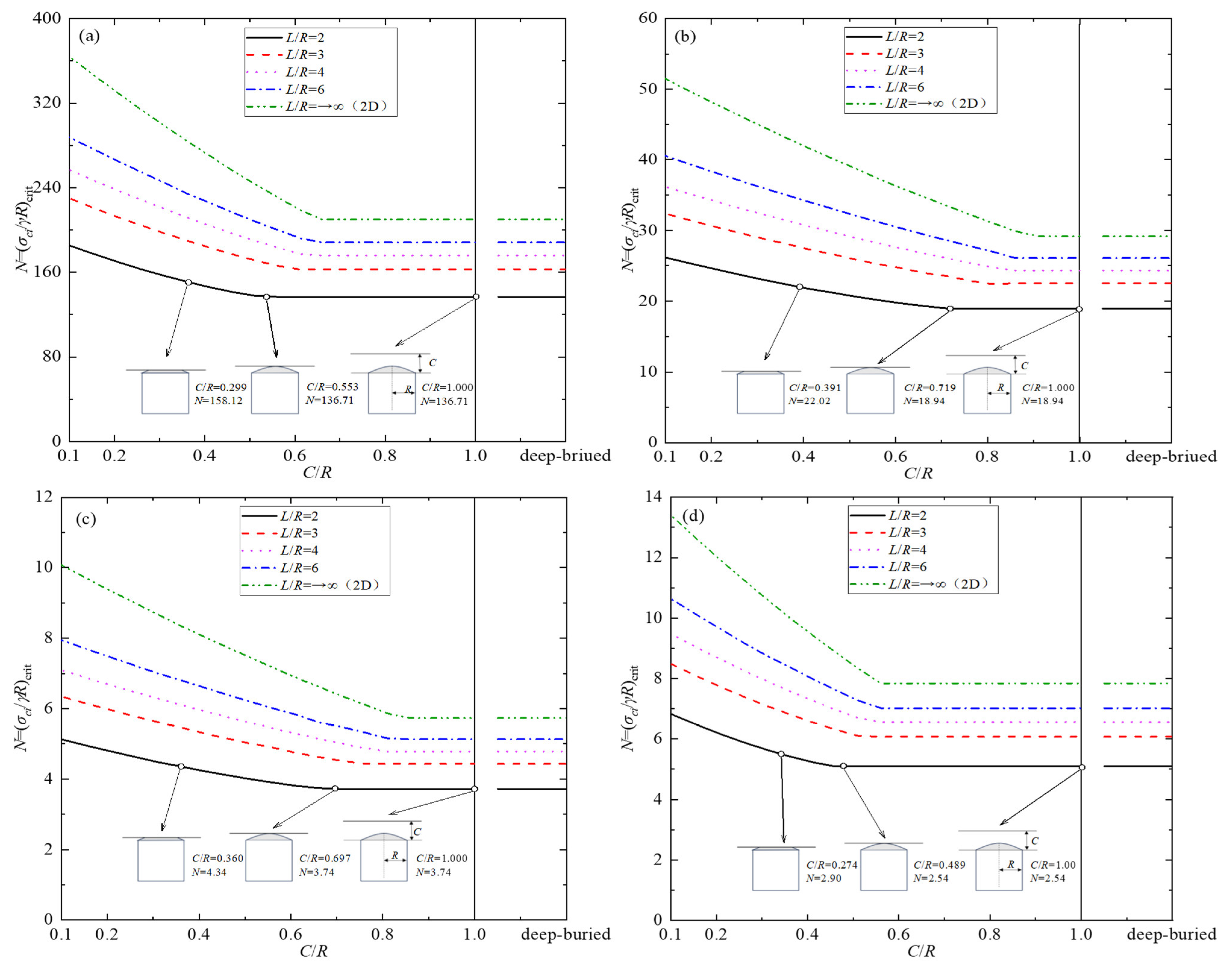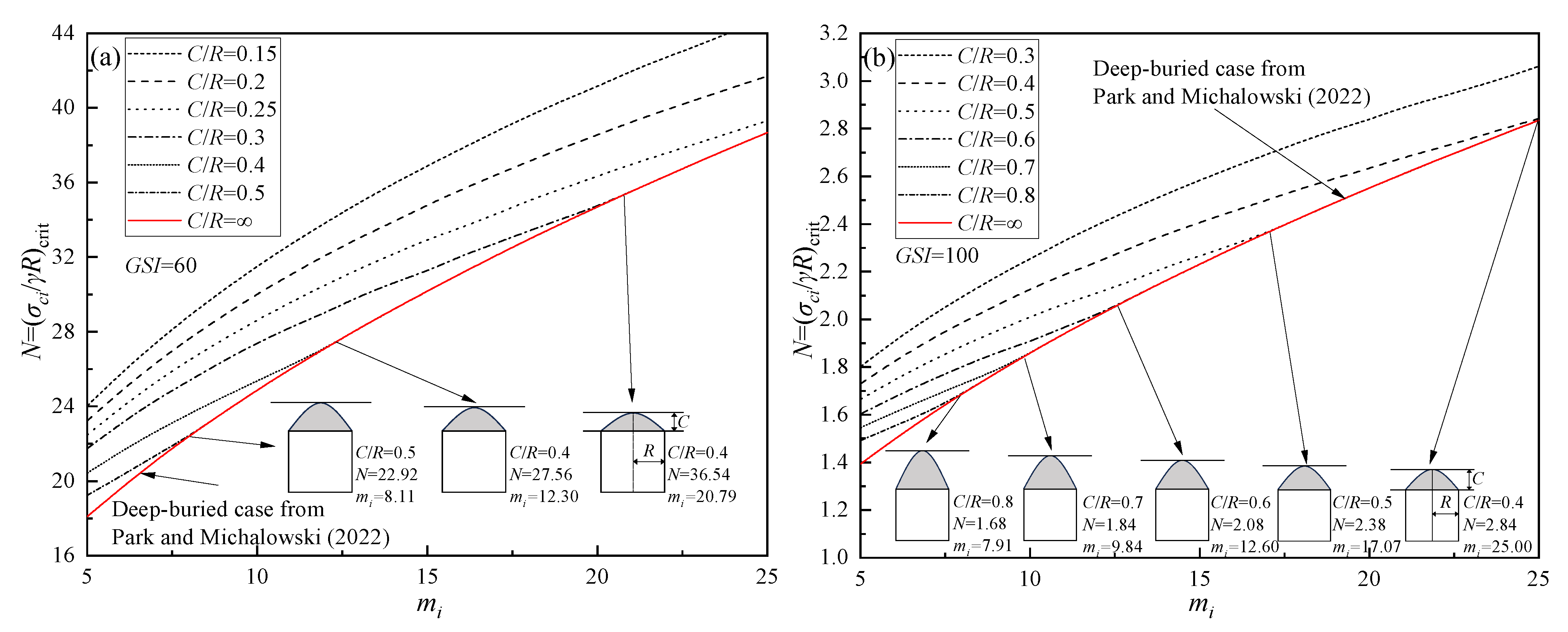 - The increases in the buried depth ratio C/R and the strength index GSI have significant beneficial effects on the stability of cavity crowns by reducing the stability number, while increases in mi and L/R weaken this stability by increasing the stability number. Once C/R reaches the critical buried depth, the cavity crown transitions to a deeply buried case; further increases in C/R will no longer impact the stability of the cavity crowns.