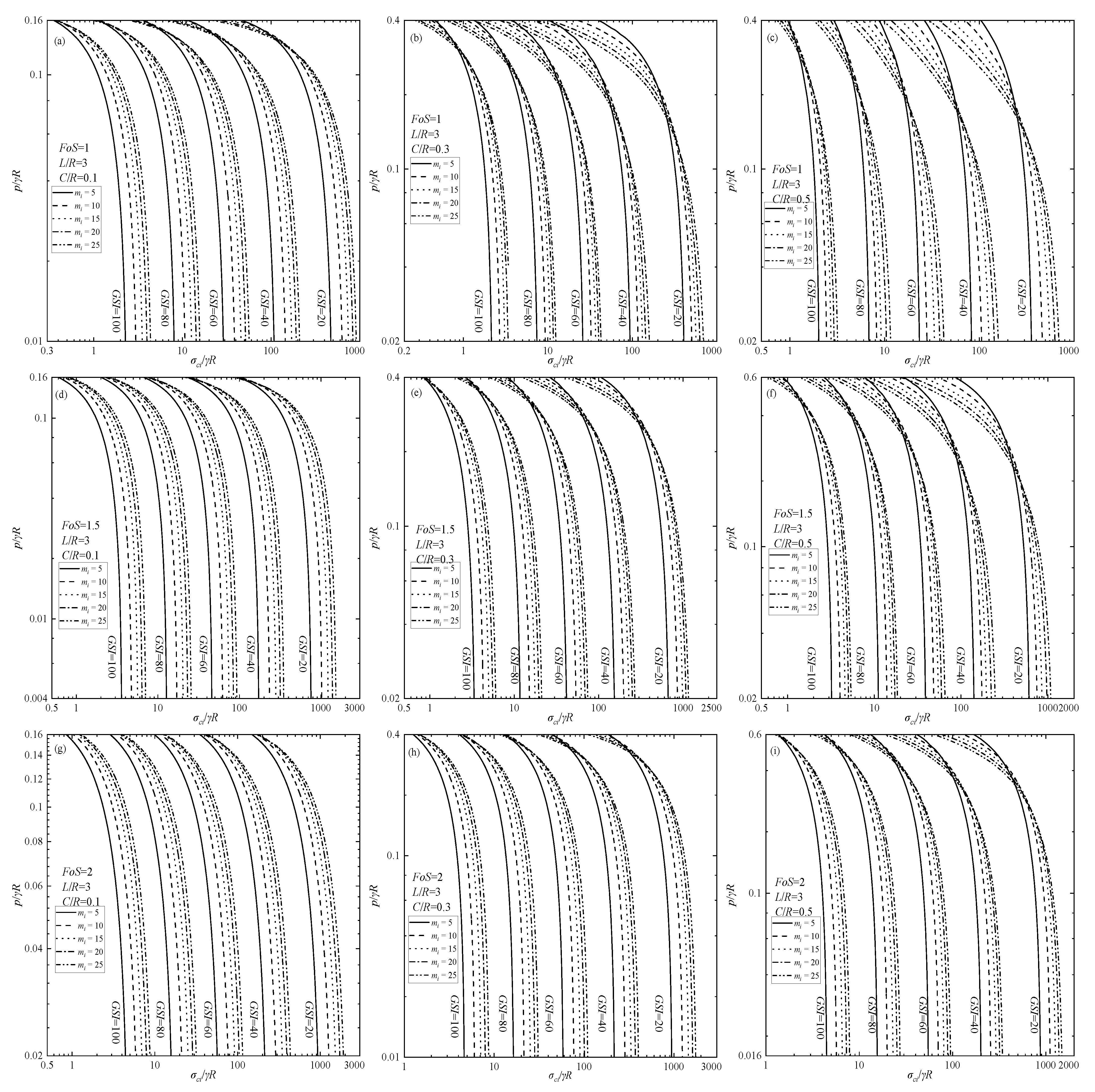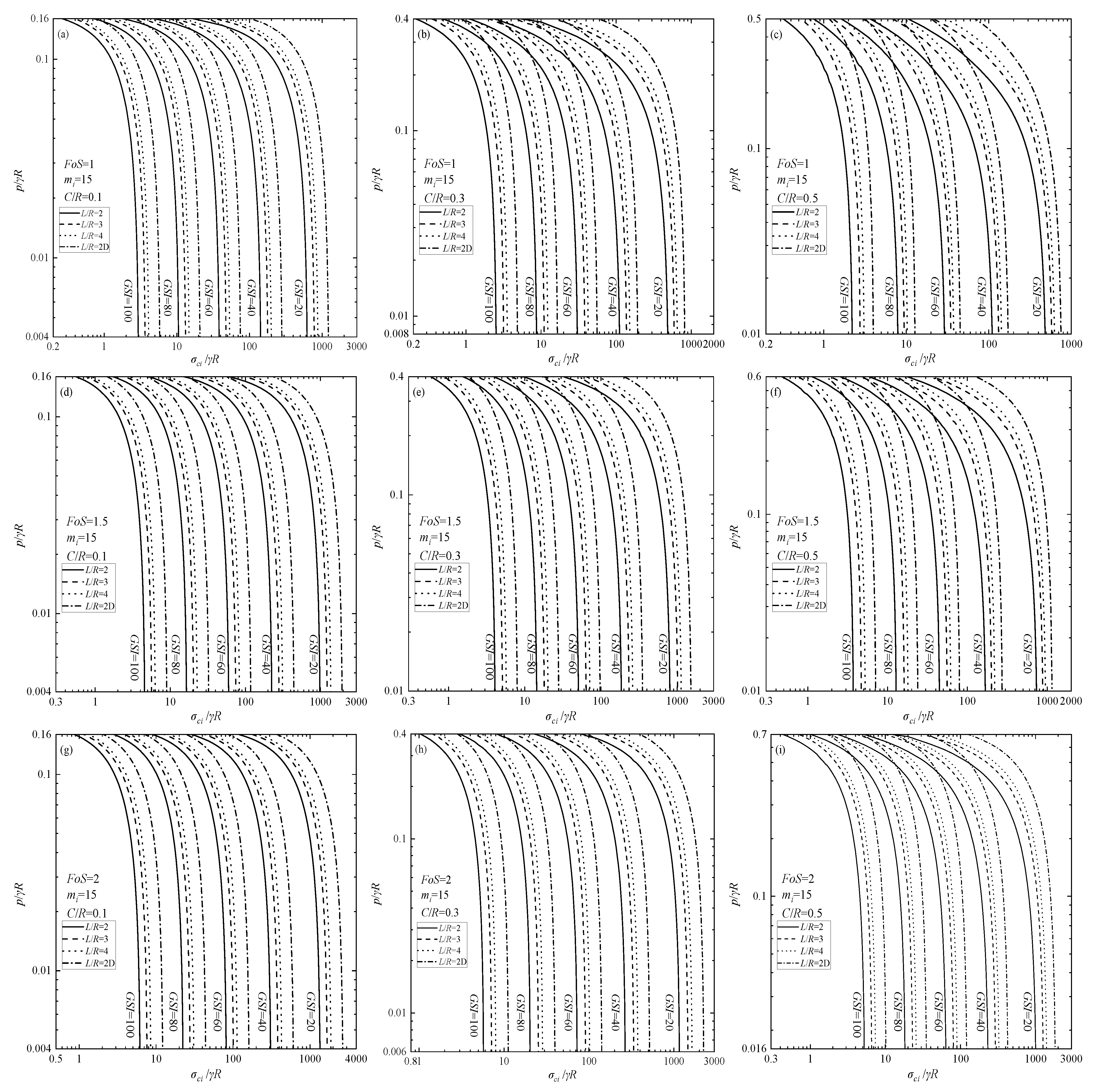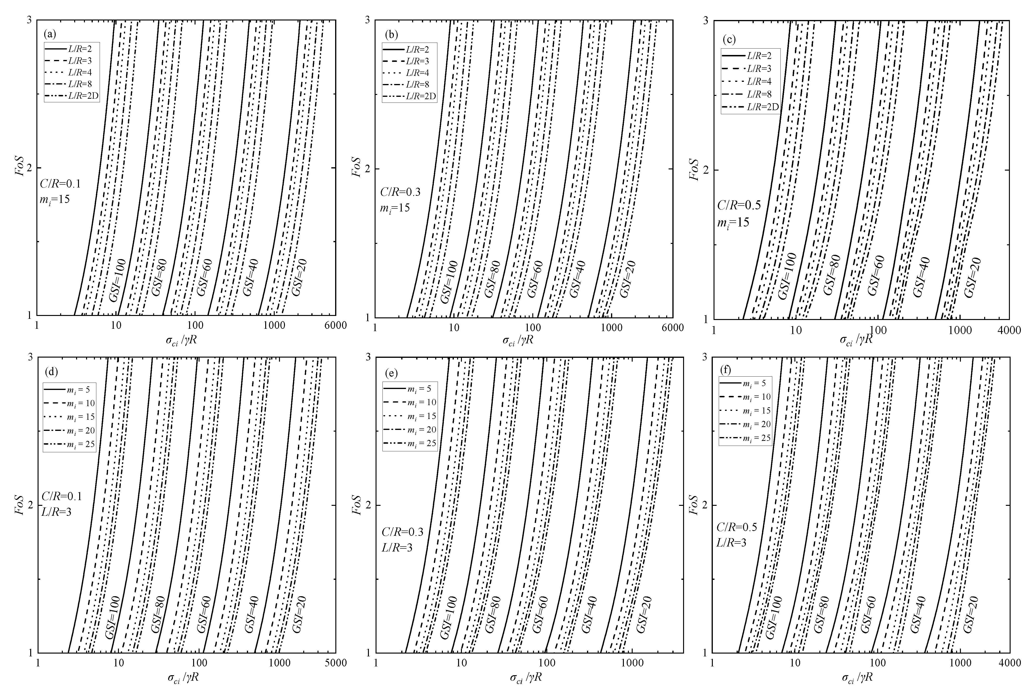 - From the required supporting pressure, it can be seen that the increase in L/R will obviously reduce the crown stability by increasing the required supporting pressures. The increase in the dimensionless index σci/γR not only results in an opposite trend in the required supporting pressure, but also affects the mode of influence of mi on the required supporting pressure. The required supporting pressure decreases with the increase of mi under a smaller σci/γR. On the contrary, as σci/γR increases, the required supporting pressure increases with the increase of mi.