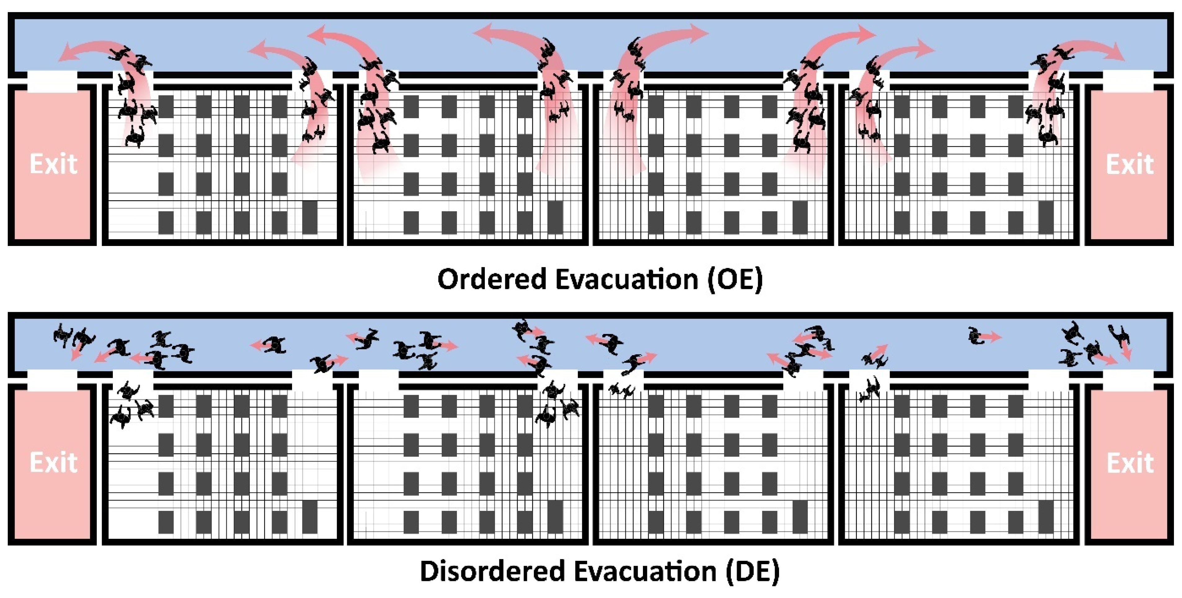 7]. Among these, ordered and disordered evacuations are the most widely applied owing to their structural simplicity and broad applicability. Ordered evacuation is a planned process guided by unified commands and predetermined routes, whereas disordered evacuation lacks centralized control and relies on individual judgment and autonomous action [