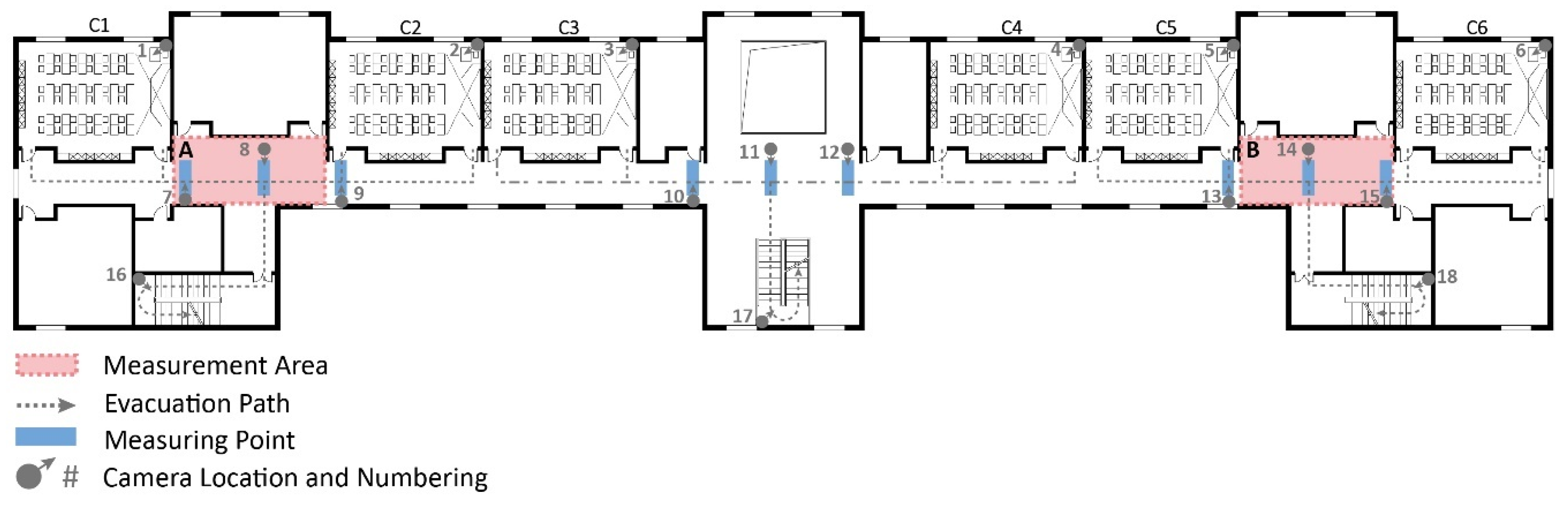 Fixed conditions of architectural circulation spaces: The teaching building used in the experiments had pre-existing architectural features, including corridor width, stair dimensions, and door placement, which could not be adjusted. These spatial constraints may significantly affect grouping behavior and the manifestation of evacuation forms. Accordingly, the uniformity of spatial parameters could restrict a systematic evaluation of how variations in spatial configuration could affect grouping behavior, thereby limiting deeper insights into the role of architectural design in evacuation mechanisms.