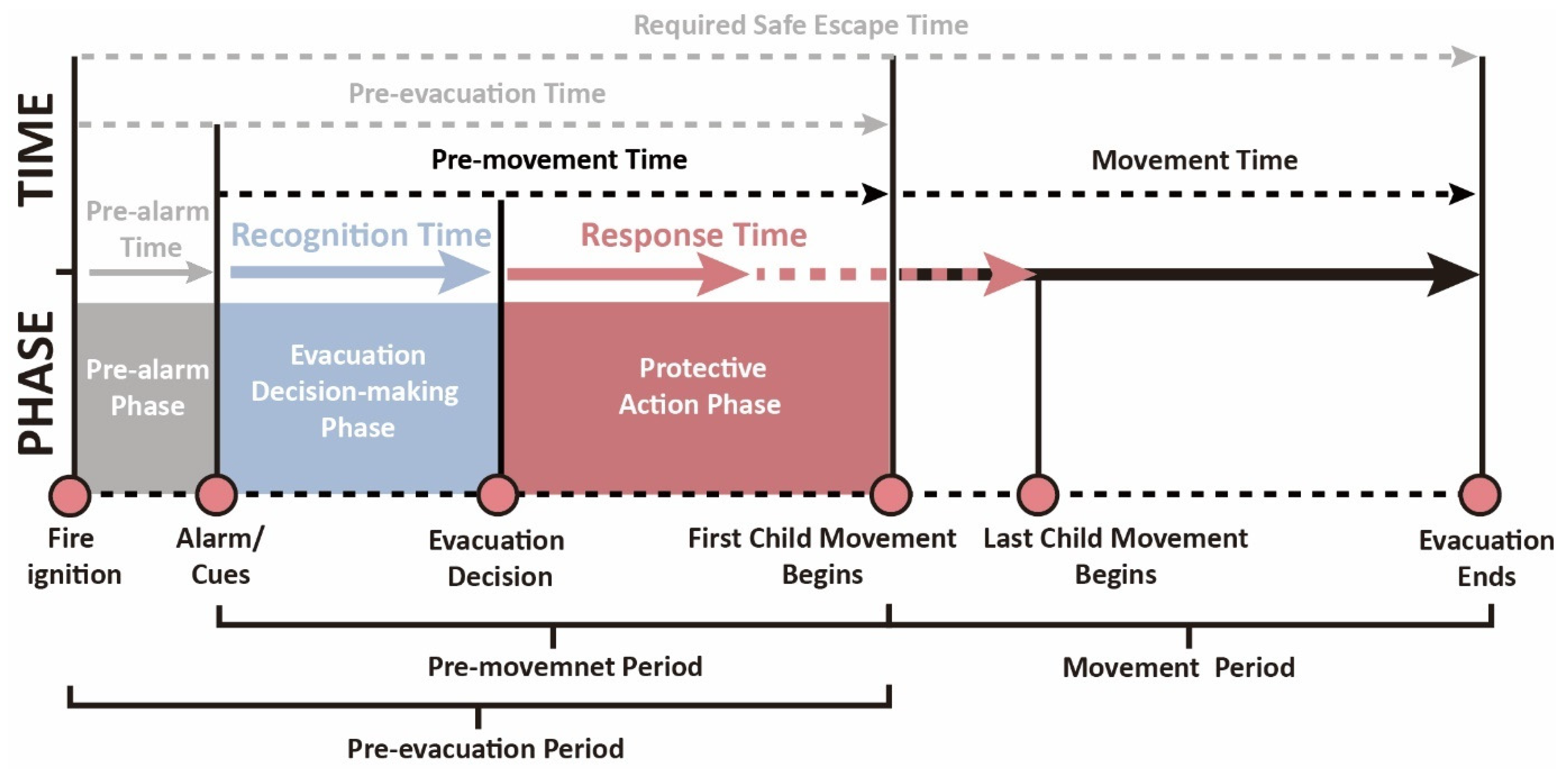 11]. Beyond physical ability, perceptual and cognitive factors also play a crucial role. For instance, variations in alarm sounds can alter children’s physiological responses and risk perception, subsequently influencing the initiation of evacuation [