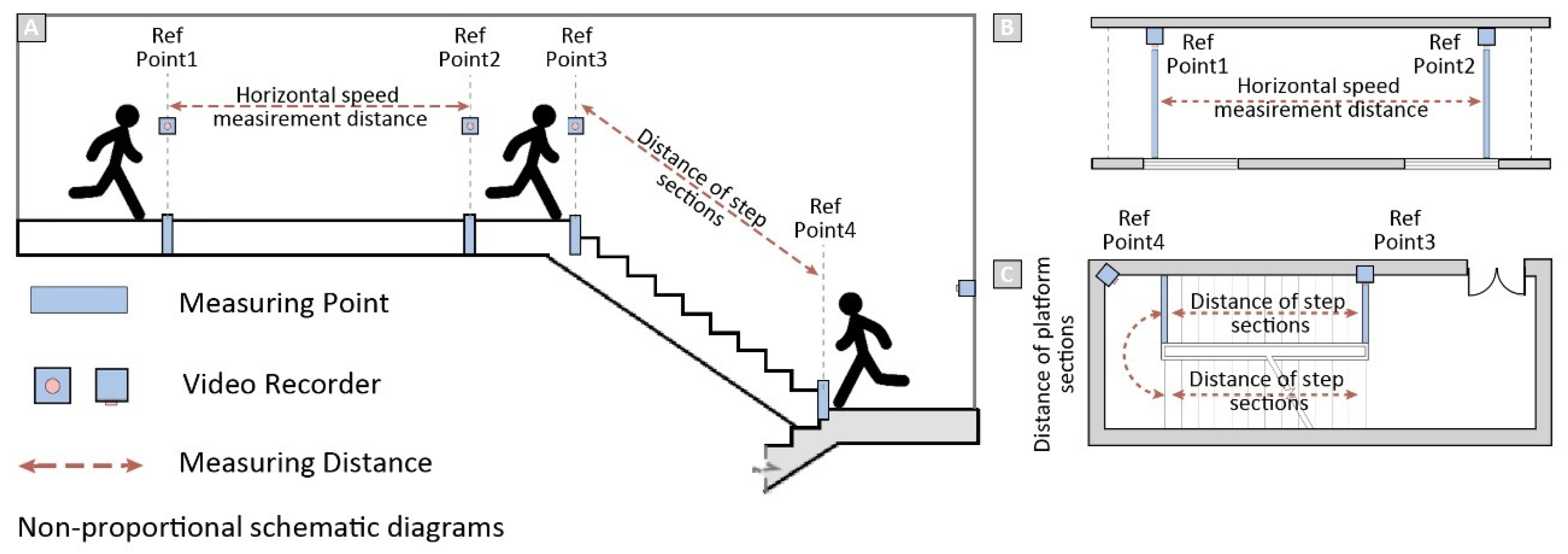 55]. Similarly, Ono et al. pointed out that the pace of children descending stairs was mainly determined by step geometry (e.g., riser height and tread depth) rather than individual stride length or body size, further confirming the dominant role of physical structure in stair movement behavior [
