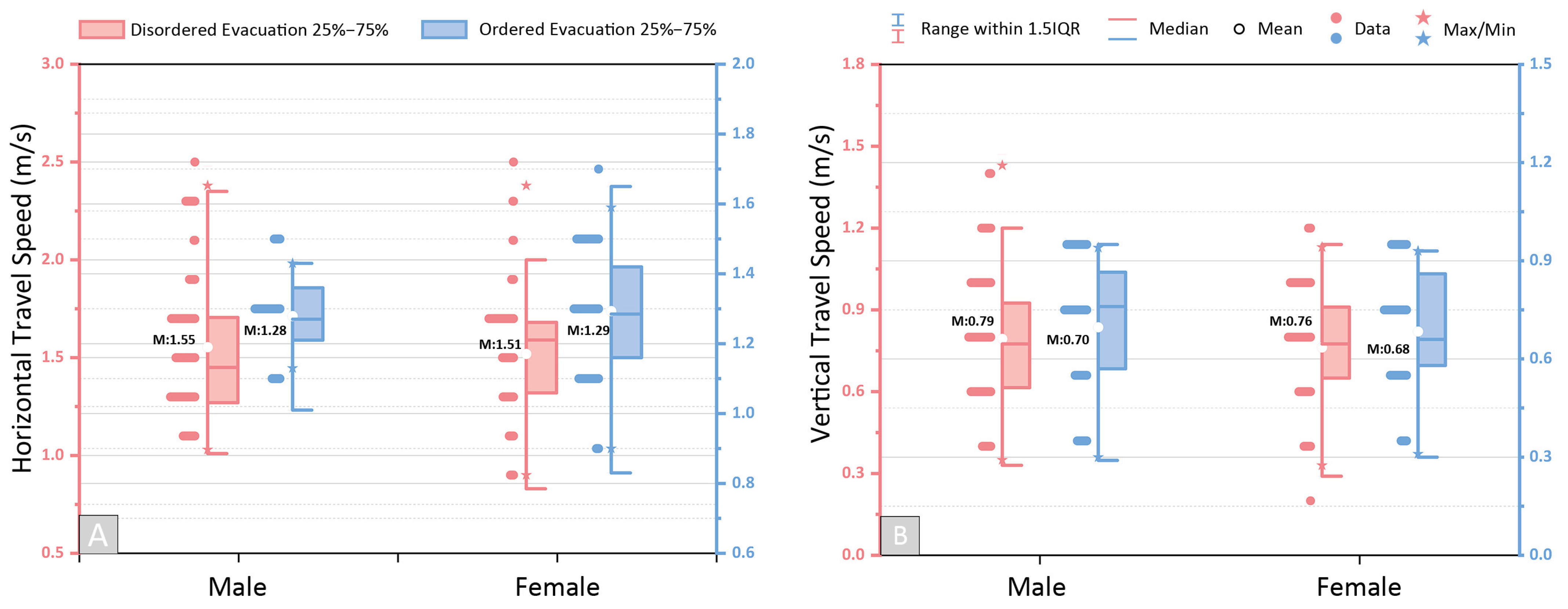 26]. Statistical tests showed that changes in grouping behavior under ordered versus disordered evacuations had a statistically significant effect on horizontal movement speed, with vertical movement speed being less affected (
