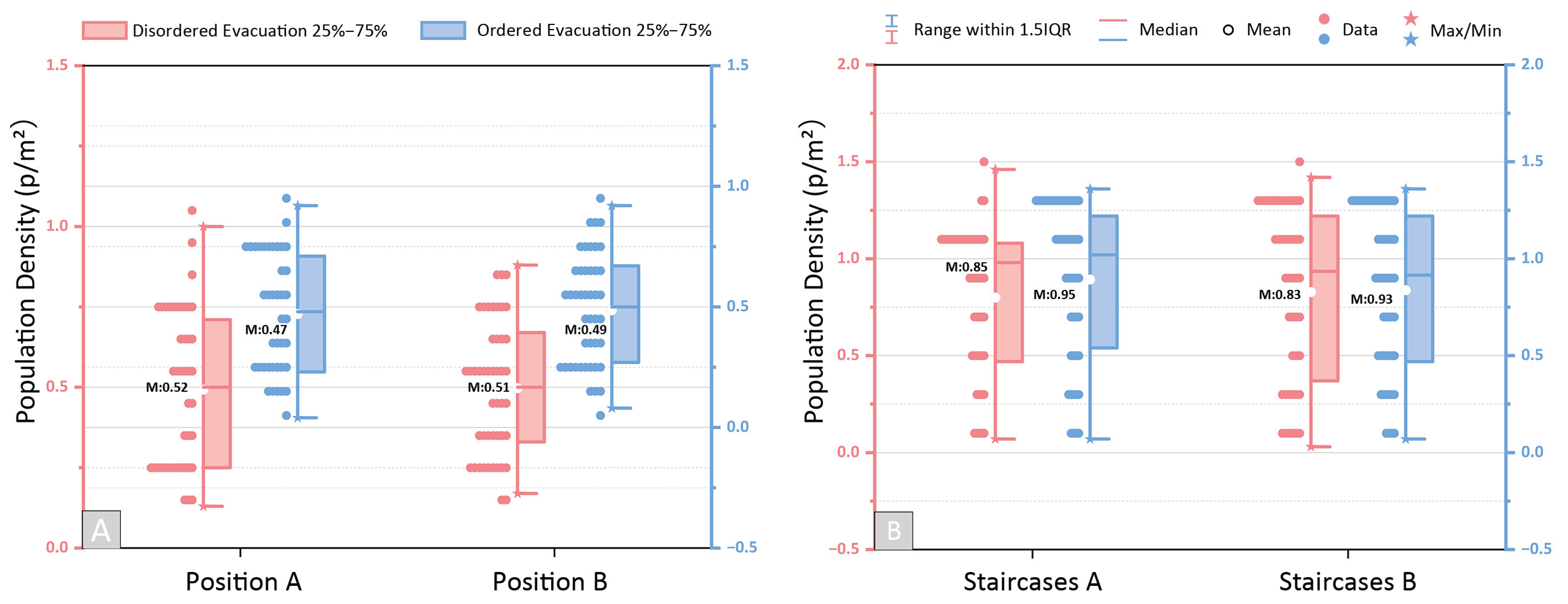 26]. In contrast, within the same evacuation drill, differences in crowd density between the two stairwell entrances were not significant (