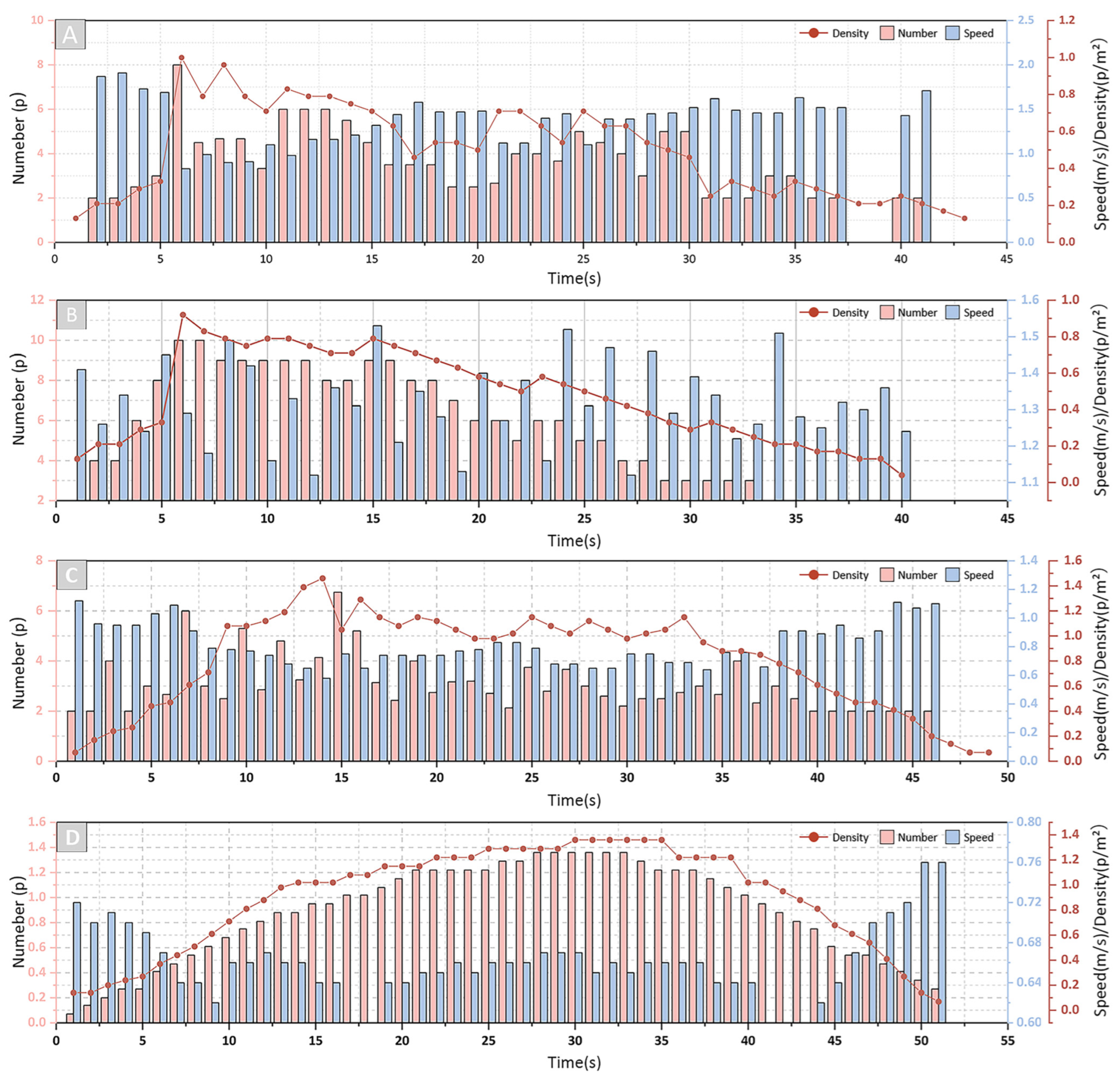 Figure 8 illustrates the temporal variations in crowd density, group size, and group speed in the corridor and stairwell areas during the two evacuation drills. In the corridor area, disordered evacuation behavior led to larger fluctuations in crowd density, with repeated oscillations and weak correlations between group size and crowd density. Although group speed remained relatively high, it exhibited substantial variability, resulting in a passage time of 43 s. Conversely, under ordered evacuation, changes in crowd density were more stable, and a clear positive correlation emerged between group size and crowd density. Although the average speed was slower, it was more consistent, producing a slightly shorter passage time of 40 s.