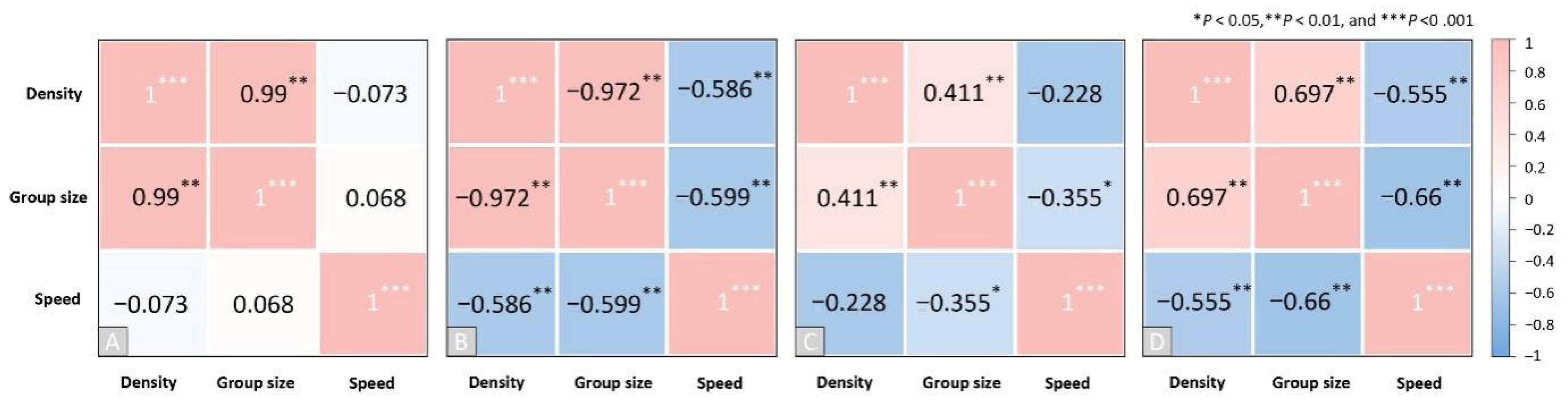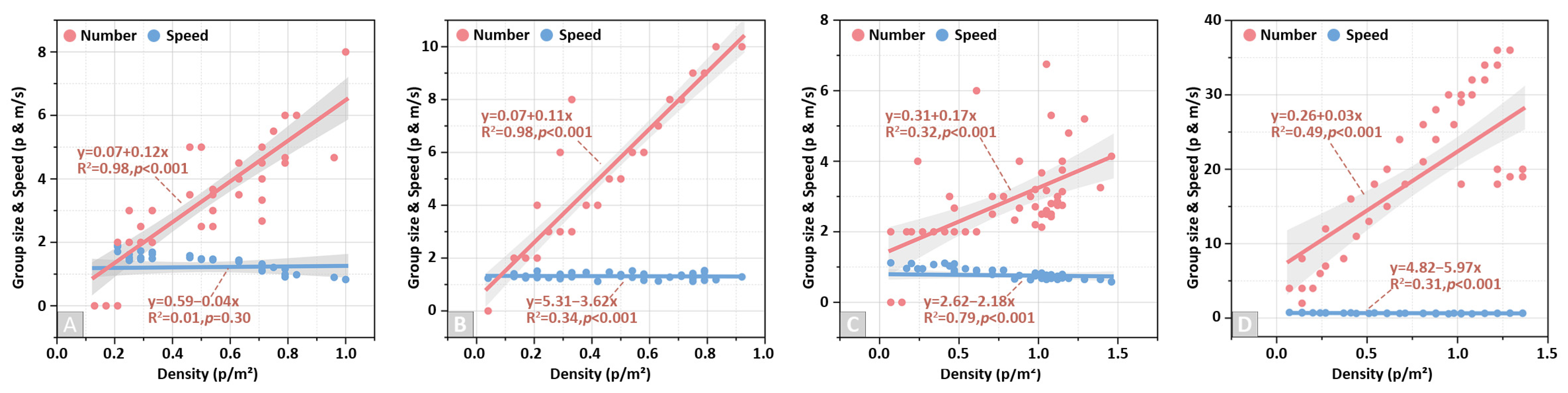 3.6. Correlations Among Crowd Density, Group Size, and Group Speed