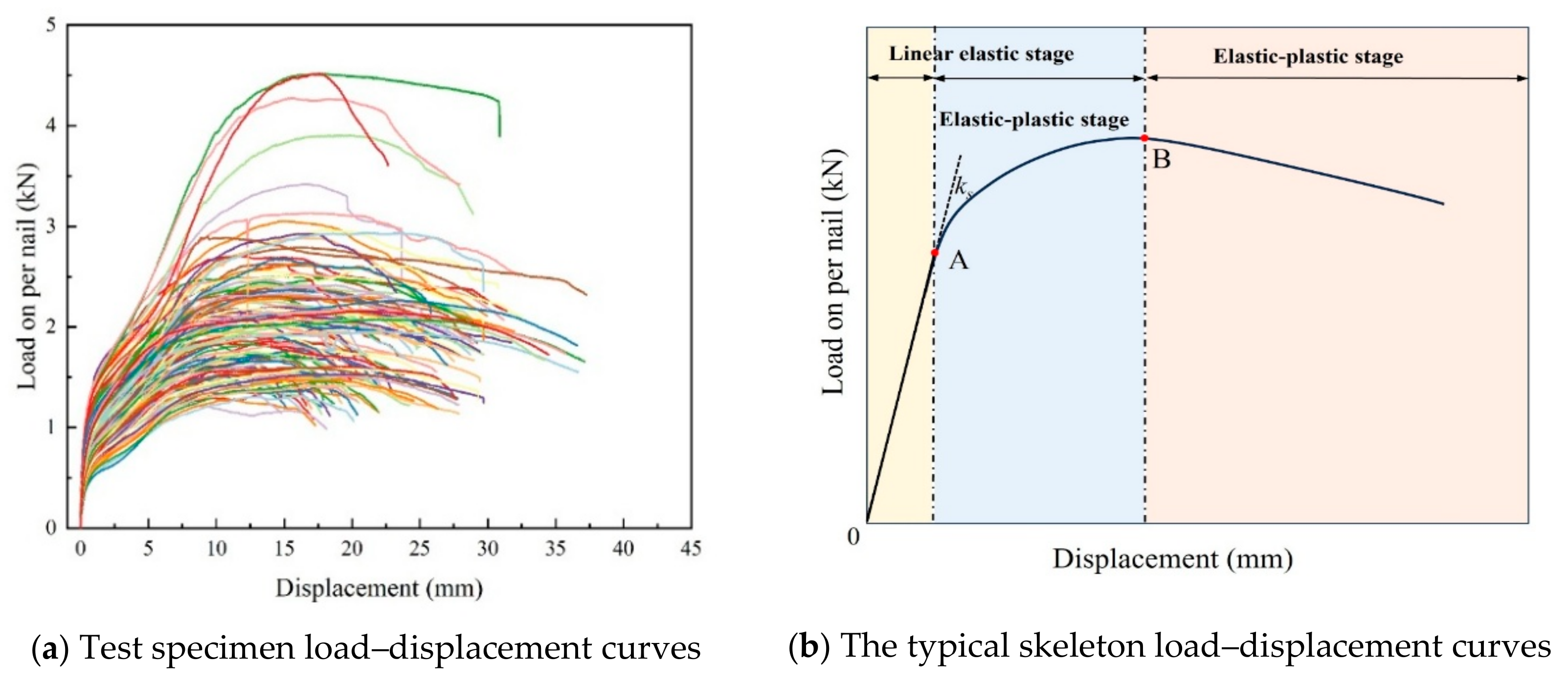- The test results demonstrate that the load–displacement curves of the nailed connections exhibited a consistent pattern of three stages: linear elastic, elastoplastic, and failure stages. This finding indicates that employing ML models to predict a simplified load–displacement curve is feasible and justified.