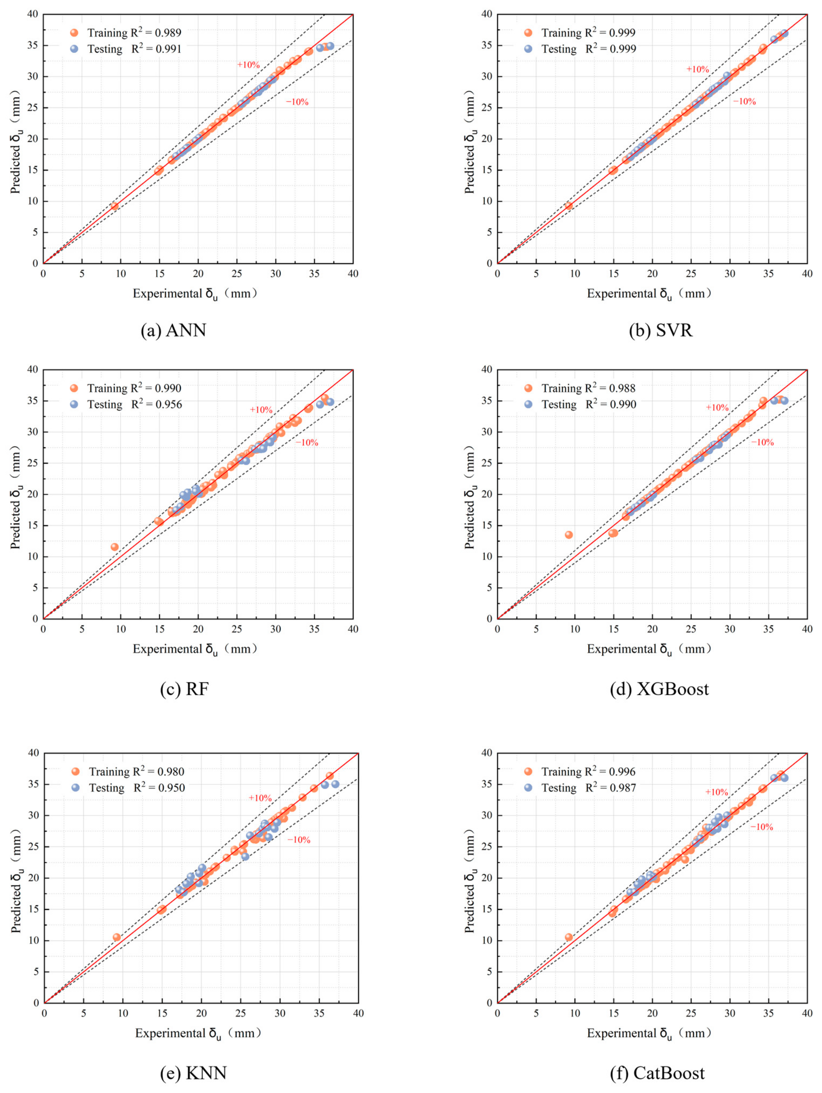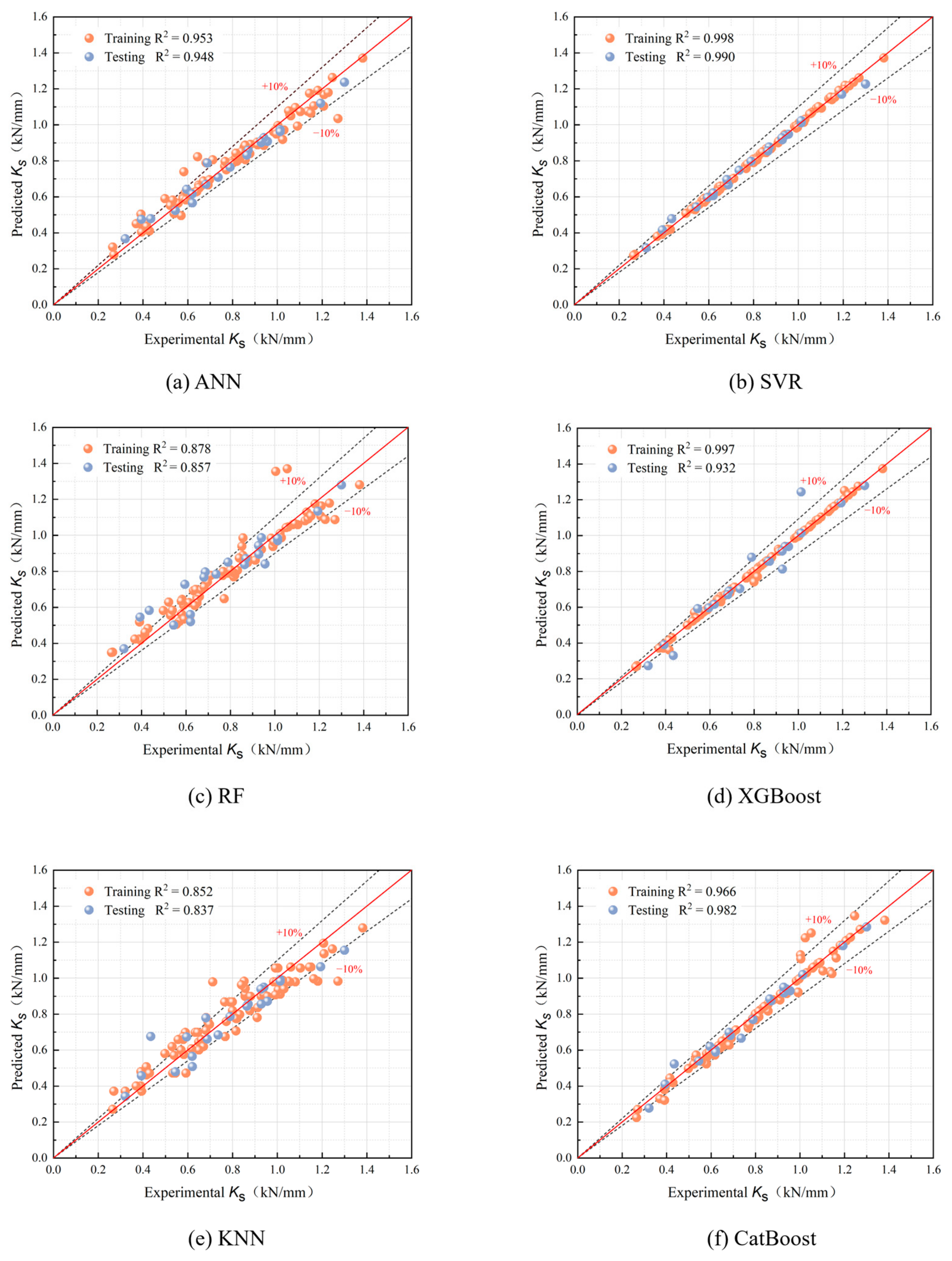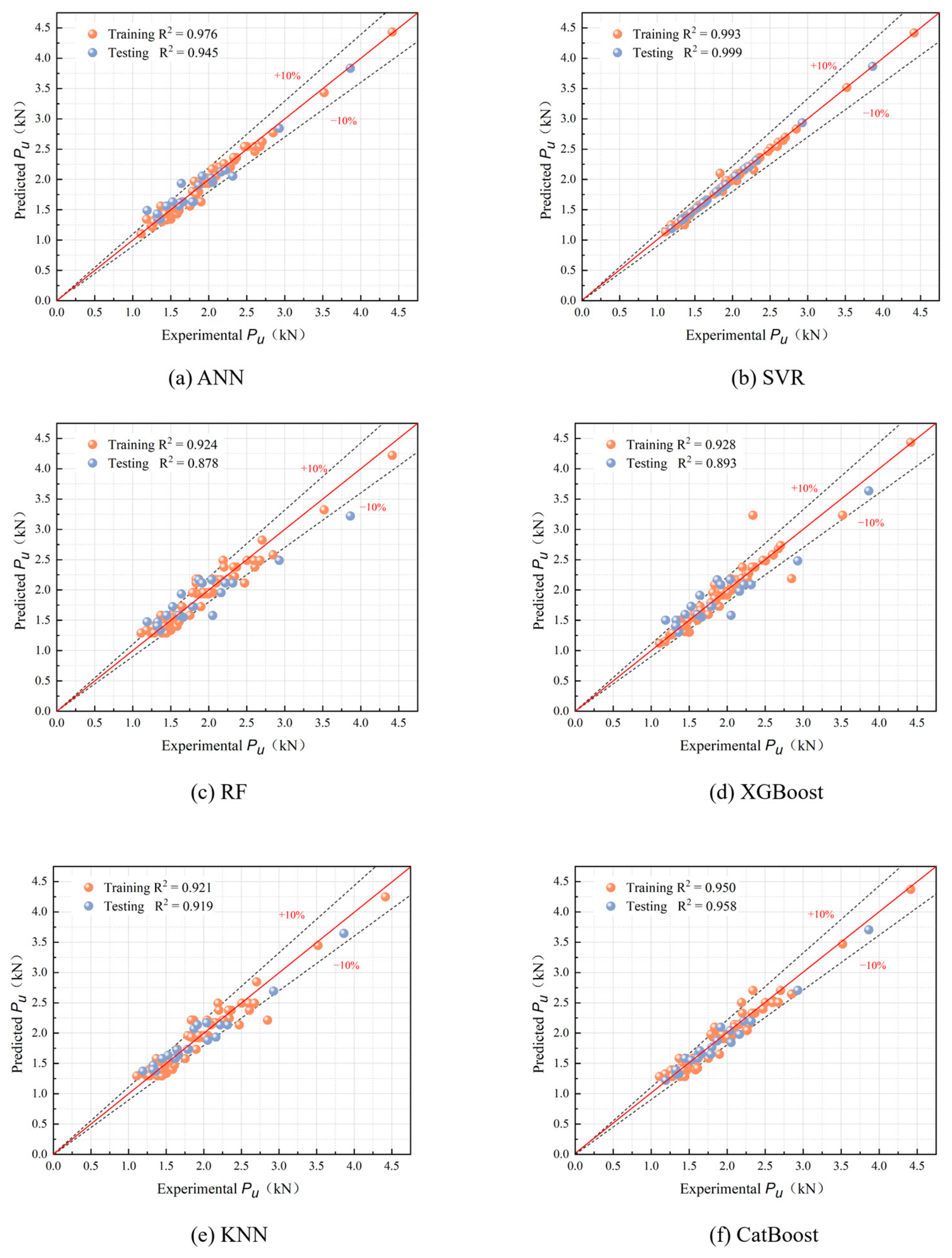 - Six ML methods (ANN, SVR, RF, XGBoost, KNN, and CatBoost) were employed to predict the ultimate load, initial shear stiffness, and ultimate displacement of the nailed connections. A comparison analysis revealed that the SVR exhibited the best performance in predicting the three characteristic values of the load–displacement curves of the nailed connection push-out specimens, achieving R2 values of 0.9950, 0.9976, and 0.9994, respectively.