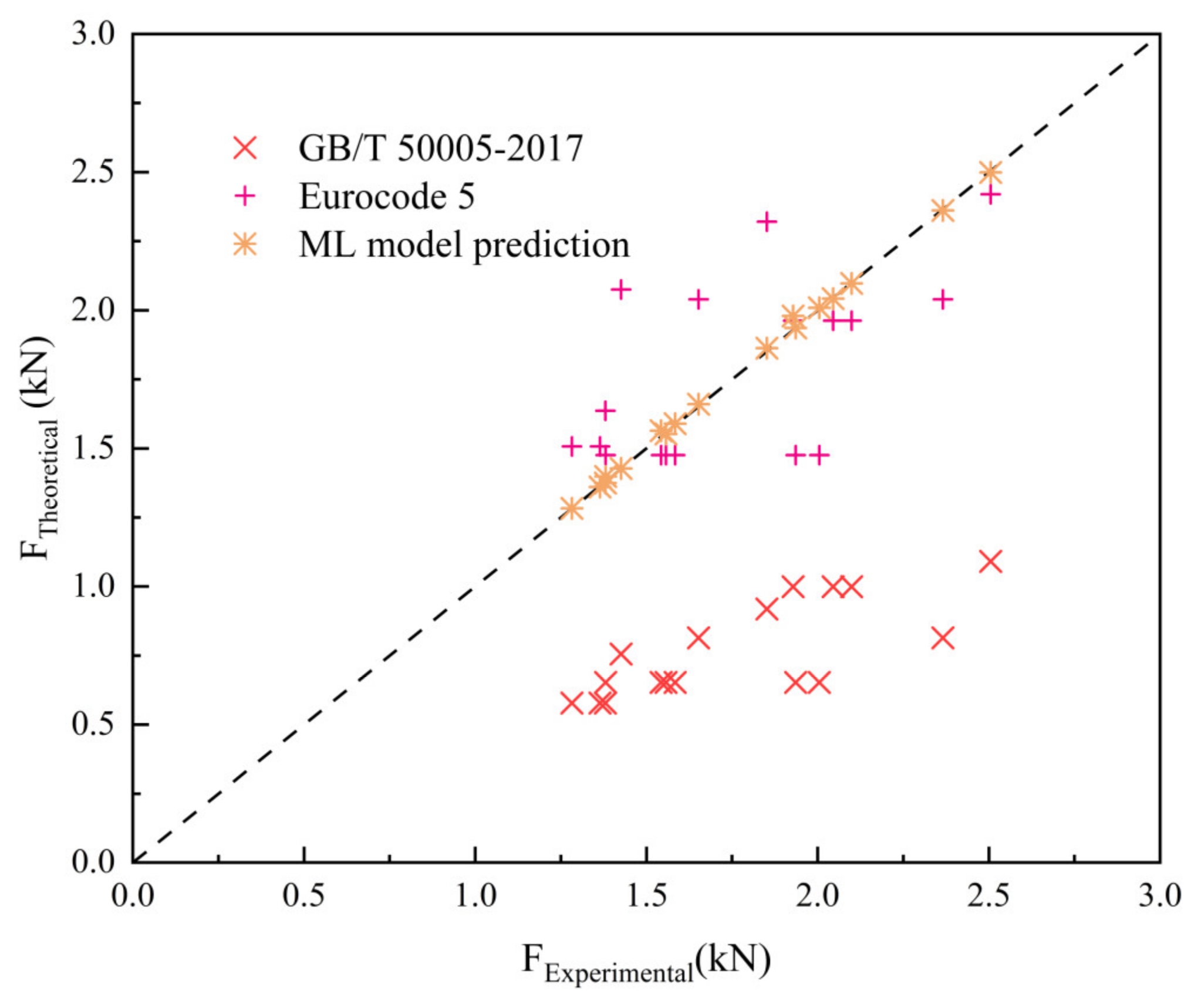 | Specimen Number | Experimental Value (Kn) | Predicted Value (kN) | Error (%) | GB/T 50005-2017 (kN) | Error (%) | Eurocode 5 (kN) | Error (%) |