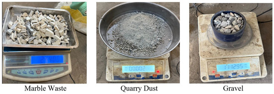 The pictures of marble waste, quarry dust, and gravel used for this study are presented in Figure 1. The materials used in this study consisted of the Nigerian Dangote Ordinary Portland cement (OPC) with a strength class of 42.5 MPa, which served as the binder. The fine aggregate employed was quarry dust, characterized by a size range of 0–4.75 mm and a specific gradation that conformed to standard specifications. Quarry dust, a by-product of the quarrying process, was selected for its potential to enhance the workability and strength of the concrete. The coarse aggregates used were gravel and marble waste, with a size range of 4.75–20 mm and a gradation that met the required standards. The gravel provided the necessary bulk and strength to the concrete, while its size and gradation contributed to the overall texture and performance of the mixture. The combination of these materials was utilized to produce concrete samples for the study, with the specific characteristics of each component influencing the resulting properties of the concrete.