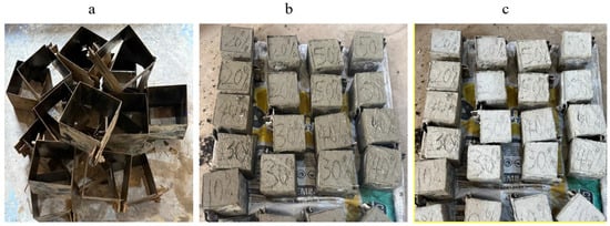 The samples were prepared according to ASTM C39 [41] (with modifications to sample shape and size) and cast into molds of 70 mm × 70 mm × 70 mm, as shown in Figure 2a. Although the ASTM C39 specifically mentions cylindrical specimens, it is commonly used for testing concrete cubes as well, with adjustments made for the different sample shape. The fresh concrete samples were presented in Figure 2b, while the demolded samples after 24 h of casting were presented in Figure 2c. The concrete samples were cured in a water bath, a process that involves submerging the samples in a temperature-controlled tank of water, typically maintained between 20 °C and 25 °C (68 °F to 77 °F), to ensure a consistent and humid environment. The water bath curing technique helps provide the qualities of concrete that are necessary for its performance in a variety of applications by preserving ideal conditions.