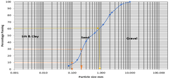 A sieve analysis was conducted on the fine aggregate used for this evaluation using ASTM C136/C136M-19 [46]. The particle size distribution of the fine aggregate (quarry dust) used for this study is presented in Figure 4. The graph shows that the quarry dust has a uniformity coefficient (Cu) of 9.0, with a curvature coefficient (Cc) of 1.00. Hence, quarry dust is classified as uniformly graded.