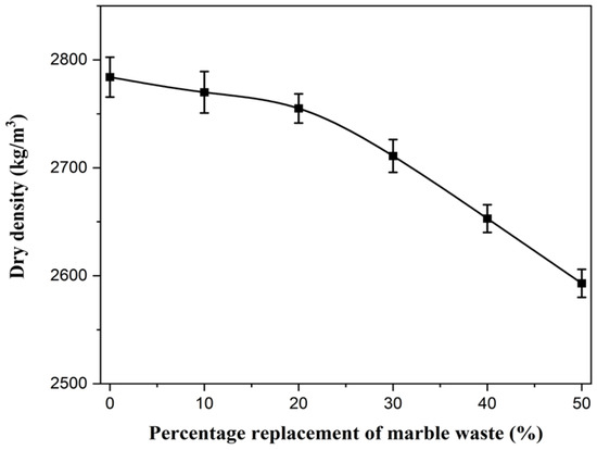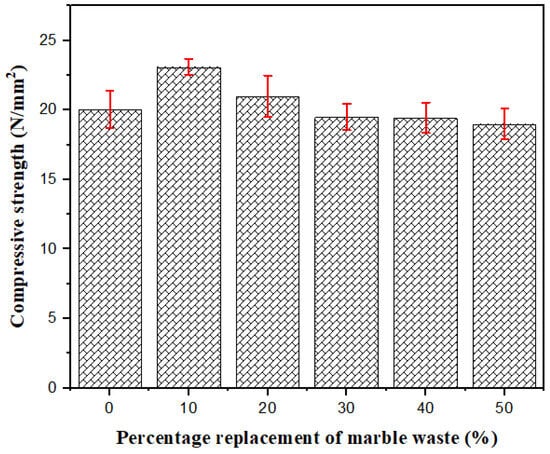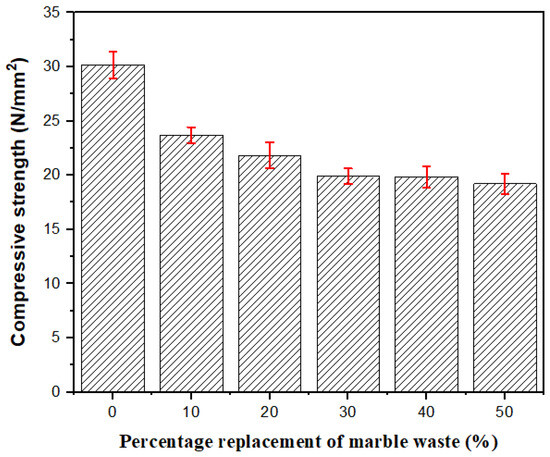As the percentage replacement of marble waste increases, the 28-day compressive strength decreases, as presented in Figure 7. The observed decrease in the compressive strength is due to the reduced workability of the concrete resulting from the smoothness of the marble waste aggregates. The smoothness of the marble waste aggregates results in decreased cohesion (binding) of the aggregates of the concrete mix, leading to reduced compressive strength. Additionally, the results of the dry density shown in Figure 5 indicate that an increase in the dry density results in an increase in compressive strength, as shown in Figure 7.