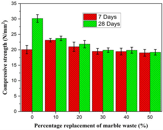 Comparison of the 7-day and 28-day compressive strength indicates that replacing the gravel with marble waste resulted in early strength gain, as shown in Figure 8. The results show that by 7 days, the samples containing marble waste have gained more than 90% of their strength, making them suitable for use in conditions that require early strength gain. However, the control mix indicates gradual strength gain as it gains significant strength after 28 days, when compared to the 7-day strength. As the percentage replacement of marble waste increases, the compressive strength increases.