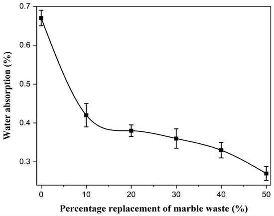 - As the percentage of marble waste increases, the water absorption reduces. Conventional concrete samples have higher water absorption compared to the concrete samples produced with marble waste. This implies that rigid pavement produced using marble waste will be more durable.