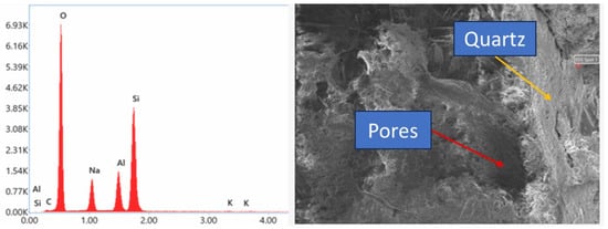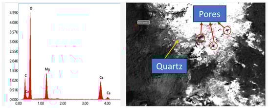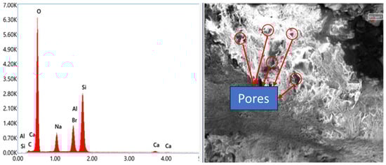 Based on the results of the compressive strength test, some samples were selected for scanning electron microscopy/Energy Dispersive X-ray Spectroscopy (SEM/EDS) conducted using SEM manufactured by Thermo Fisher Scientific (Waltham, MA, USA), and the results are presented in Figure 10, Figure 11, Figure 12, Figure 13, Figure 14 and Figure 15. Figure 10 presents the SEM/EDS of a conventional concrete sample cured for 7 days. The SEM image shows the presence of pores.