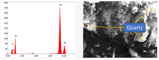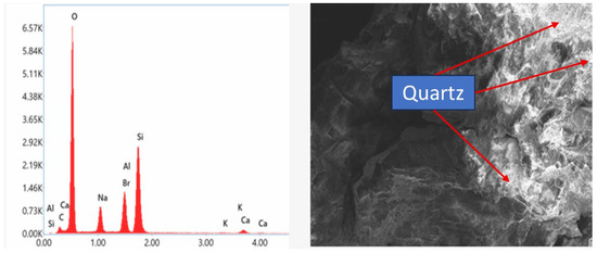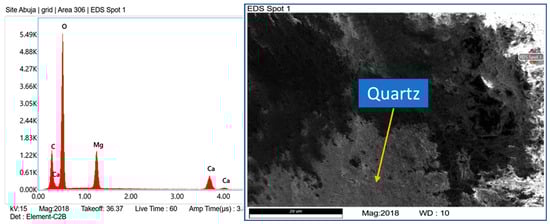 Figure 11 presents the SEM/EDS results of the marble waste modified sample produced using 10% marble and cured for 7 days. The image indicates the attribute of cementitious material containing quartz and granite. Figure 12 presents SEM/EDS of the sample produced using 50% of marble waste and cured for 7 days. The image indicates a dense material structure, which could be due to the increased percentage of marble waste. As the calcium content, which contributes to the cementation/hydration process, reduces with the addition of more marble waste, the compressive strength decreases. This is in line with the obtained compressive test results, as shown in Figure 7. SEM/EDS test results of MW0 (0% marble) cured for 28 days are presented in Figure 13. The EDS indicates a high composition of pozzolanic elements (silicon and aluminum). Higher calcium content observed in the EDS of MW10 (10% marble) for samples cured for 28 days, as shown in Figure 14, is responsible for the cementation/hydration process and supports the higher compressive strength obtained for the same sample at 28 days of curing as presented in Figure 6. Figure 15 presents the SEM/EDS result of the sample produced with 50% marble waste cured for 28 days. As the calcium content, which contributes to the cementation/hydration process, reduces with the addition of more marble waste, the compressive strength decreases. This is in line with the obtained compressive test results, as shown in Figure 7.