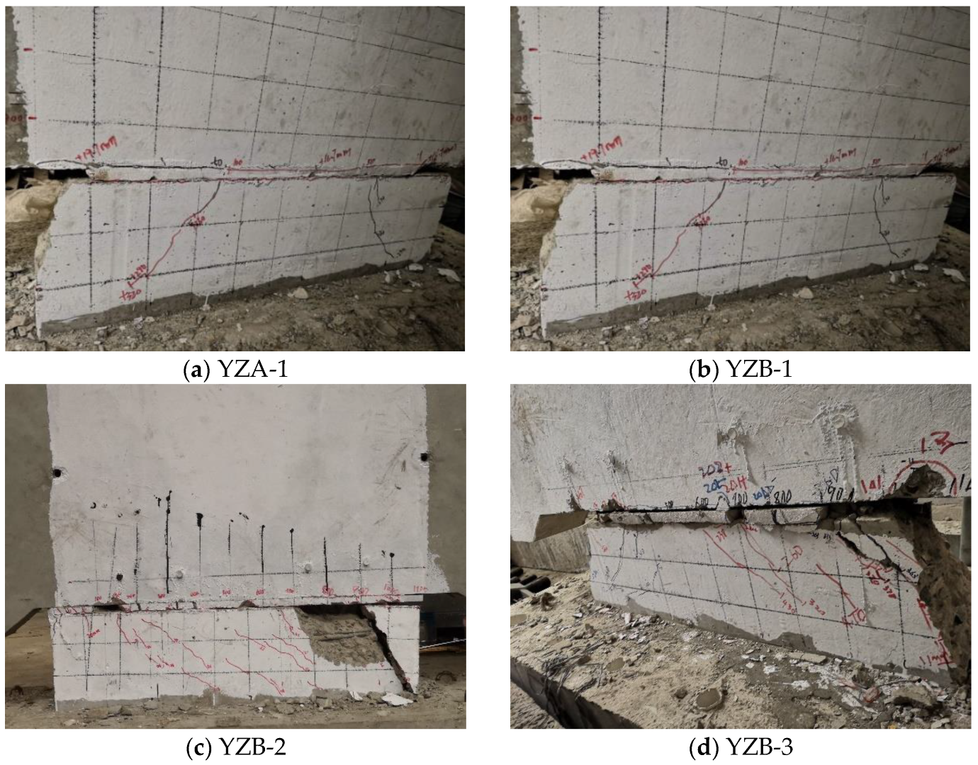 - All specimens exhibited brittle shear–compression failure characterized by grout layer crushing, through-joint cracking, and triangular block separation in the lower wall region. Increasing the bundled shear reinforcement ratio effectively enhanced the yield and peak loads, whereas a higher initial stress level in the reinforcement weakened the shear–friction mechanism, reducing the overall shear capacity.
