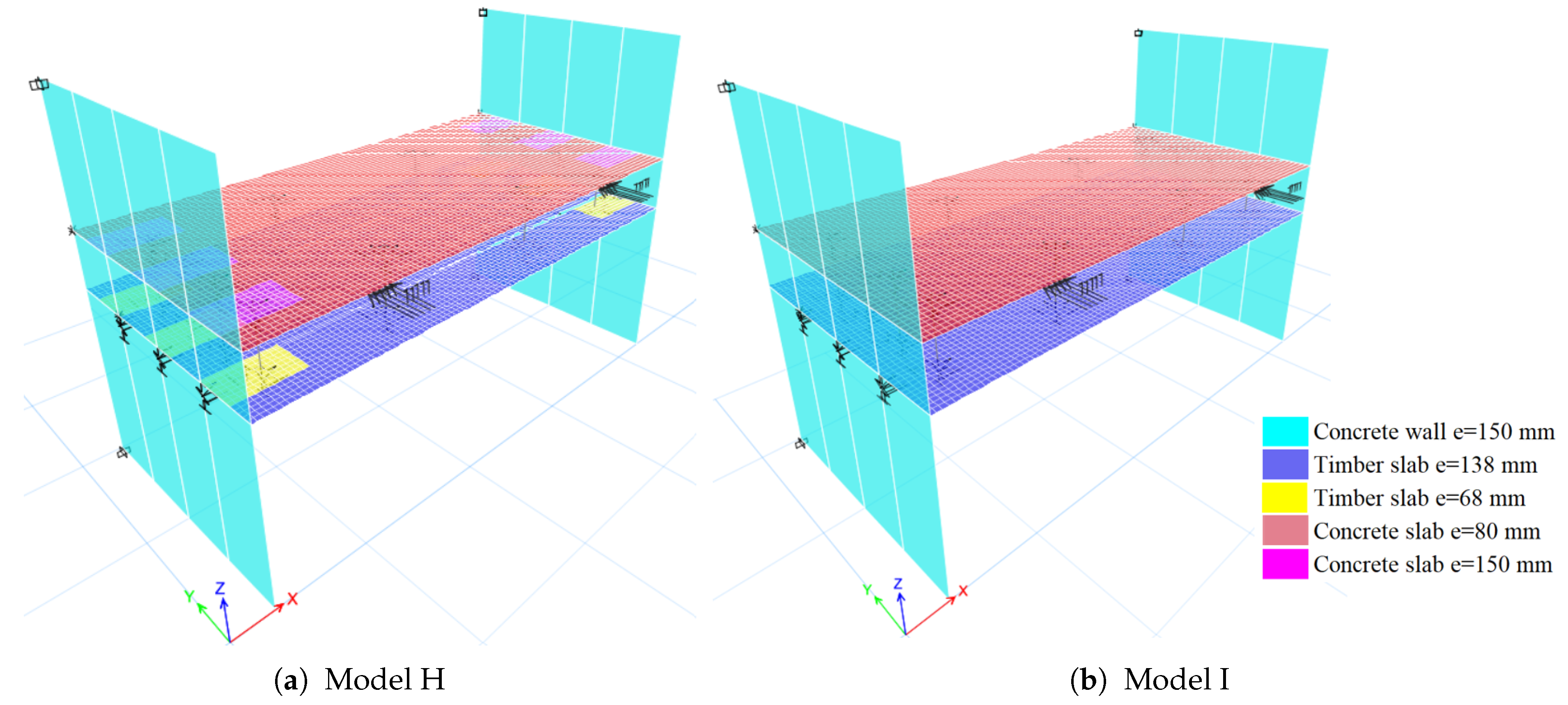 - Fragiacomo, M.; Lukaszewska, E. Time-dependent behaviour of timber–concrete composite floors with prefabricated concrete slabs. Eng. Struct. 2013, 52, 687–696. [Google Scholar] [CrossRef]