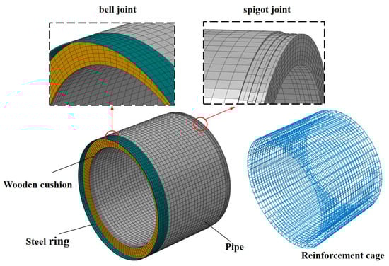 To investigate the mechanical behavior of bell and spigot joints under different offsets and jacking force levels during pipe-jacking operations, a three-dimensional numerical model of the pipe was developed using the finite element software ABAQUS 2020. The joint region was modeled in detail to capture its local stress response. Since this study focuses on the joint behavior during the jacking process, and the contact force generated by the compression of the rubber gasket has only a minor influence on the joint stress [], the rubber gasket was not modeled []. The geometry and mesh layout of the pipe model are illustrated in Figure 3.