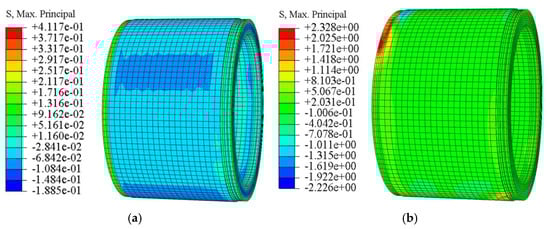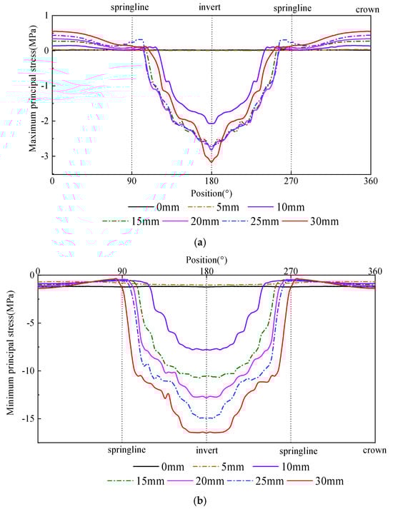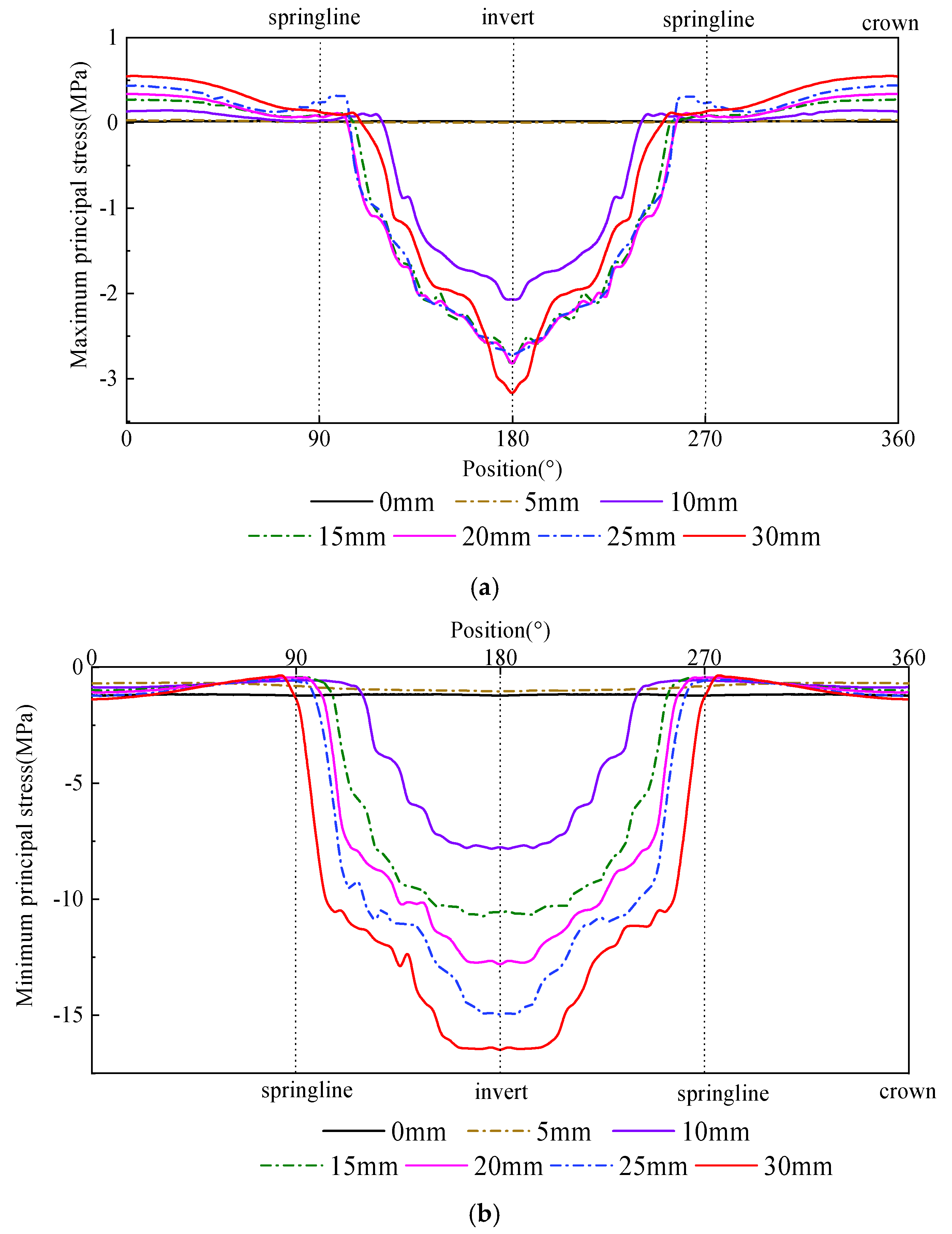 Figure 9b shows the distribution of the minimum principal stress in the concrete at the spigot-end cross-section. It can be observed that under different offsets, the minimum principal stress is symmetrically distributed along the cross-section centerline. The compressive stress in the upper part of the spigot cross-section is relatively small, not exceeding 2.00 MPa, while the compressive stress increases progressively toward the invert. This is because when vertical offset occurs between pipes, the spigot invert comes into contact with and is compressed by the steel ring of the following pipe, resulting in much higher compressive stress at the invert than elsewhere. When the offset does not exceed 10 mm, the overall compressive stress in the spigot concrete is relatively low, with a maximum of only 1.22 MPa. As the offset increases further, the maximum compressive stress in the spigot concrete begins to rise sharply, reaching 16.50 MPa at an offset of 30 mm, which is still below the compressive strength of the concrete.
