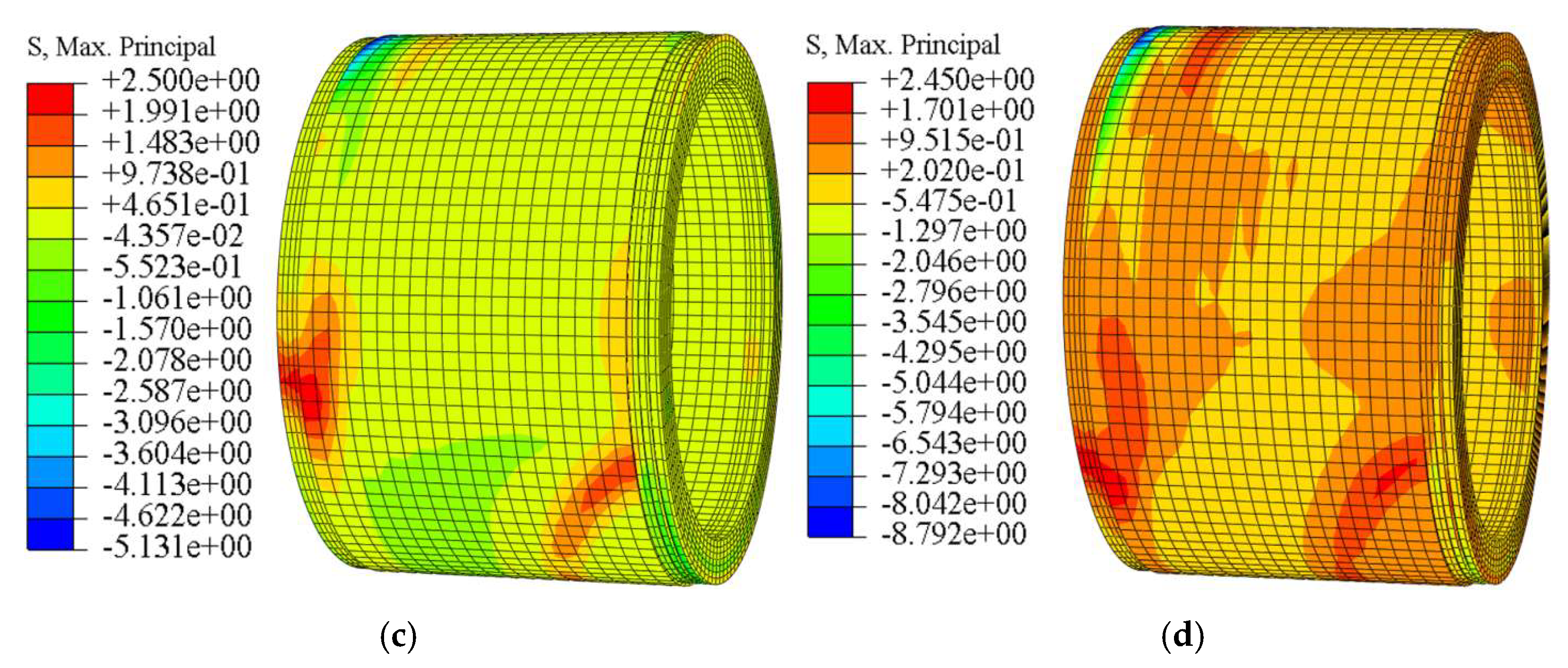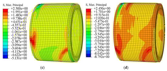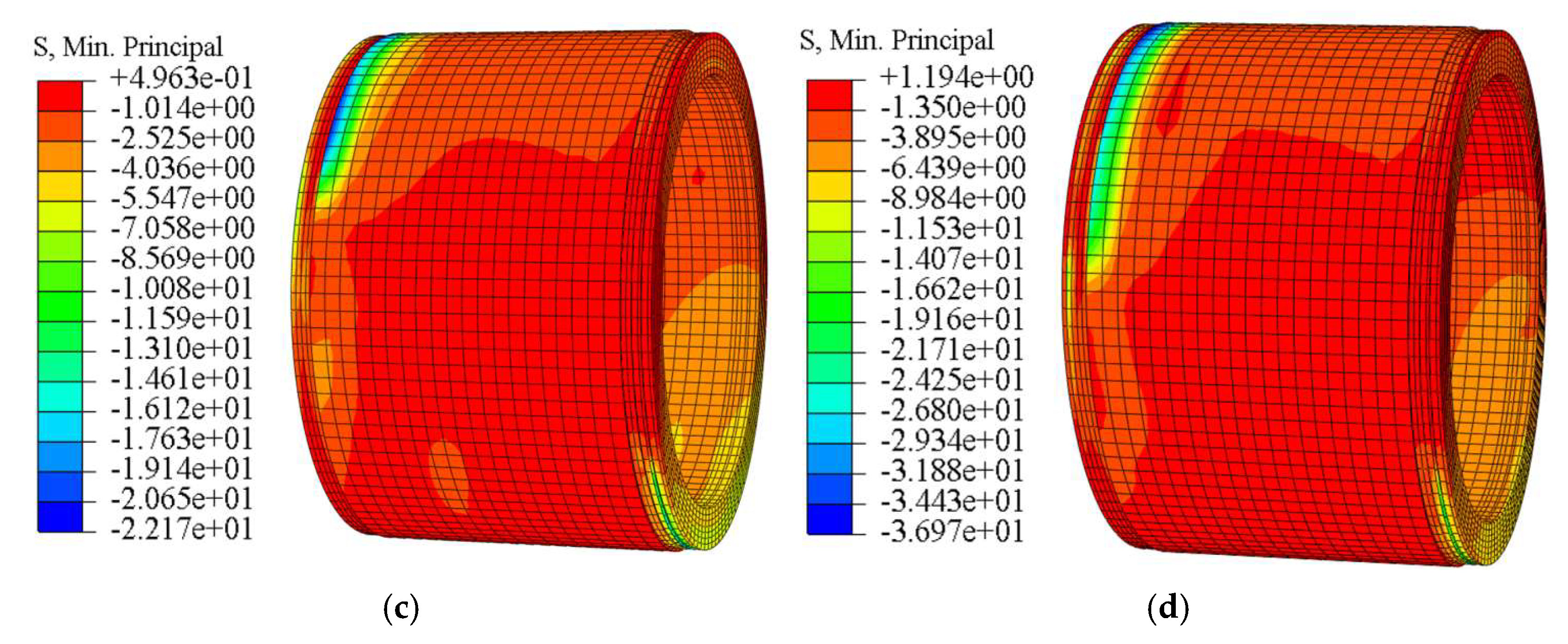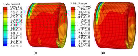 Contours of minimum principal stress of pipe under different offsets ((a) 0 mm, (b) 10 mm, (c) 20 mm, (d) 30 mm).