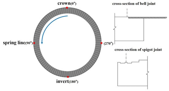 To investigate the stress distribution along the joint cross-section when an offset occurs between pipes, one representative cross-section was selected at both the bell end and the spigot end. The maximum and minimum principal stresses of the concrete were extracted circumferentially along each cross-section. The crown and invert correspond to angular positions of 0° and 180°, while the left and right springline correspond to 90° and 270°, respectively. The specific extraction path and cross-section locations are shown in Figure 7.