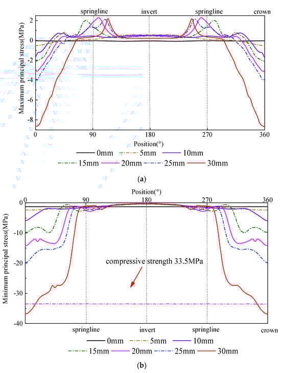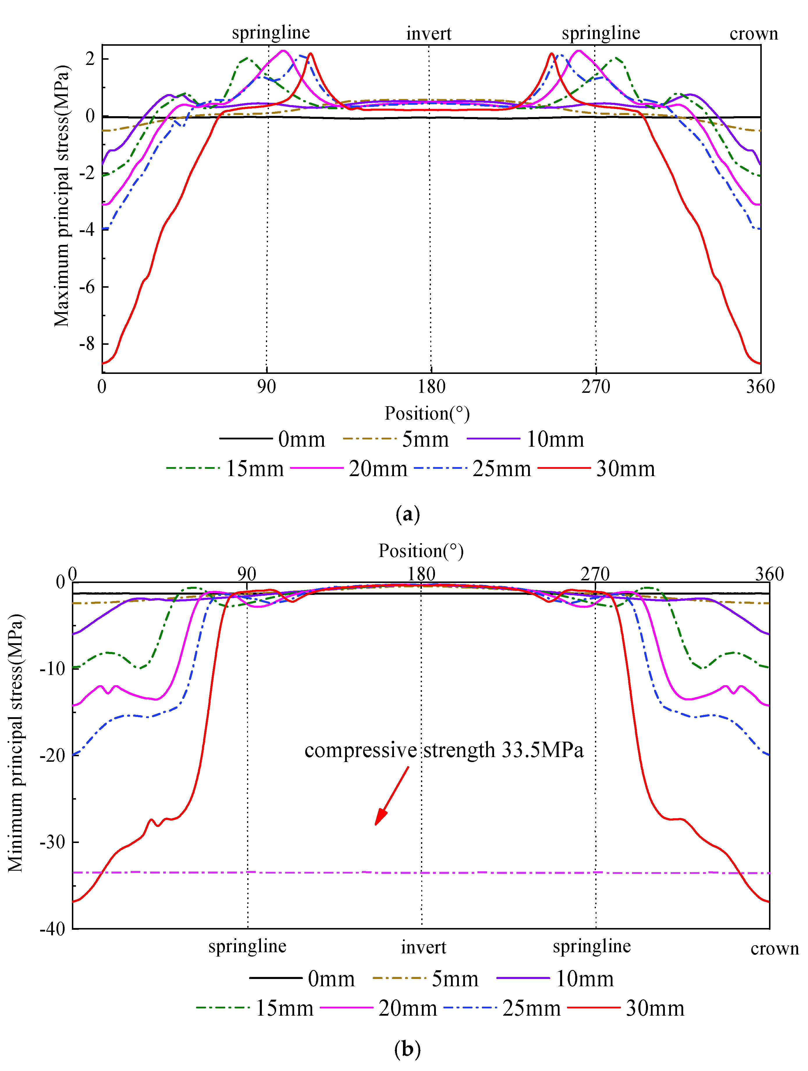 Figure 8b shows the distribution of the minimum principal stress in the concrete at the bell-end cross-section. It can be observed that the distribution pattern of the minimum principal stress remains generally similar under different offsets, with the stress symmetrically distributed along the cross-section centerline: compressive stress is greater at the crown and smaller at the invert. As the offset gradually increases, the maximum compressive stress in the bell concrete exhibits a parabolic growth trend. This is because the continuous increase in offset causes warping deformation of the steel ring at the crown, leading to a progressive rise in the compressive stress in the concrete near the contact area between the bell and the steel ring. When no offset is present (0 mm), the maximum compressive stress in the bell concrete is only 1.34 MPa. When the offset increases to 10 mm, the growth of compressive stress is still relatively small, reaching 6.02 MPa. However, with further increase in offset, the maximum compressive stress grows exponentially. At an offset of 25 mm, the maximum compressive stress reaches 19.98 MPa, approximately 15 times that of the case with no offset. When the offset reaches 30 mm, the maximum compressive stress rises to 36.93 MPa, which significantly exceeds the compressive strength of the concrete, indicating that compressive failure has occurred in the crown concrete of the bell.