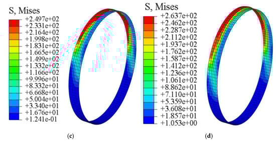 Contours of von Mises stress of steel ring under different offsets: (a) 0 mm, (b) 10 mm, (c) 20 mm, (d) 30 mm.