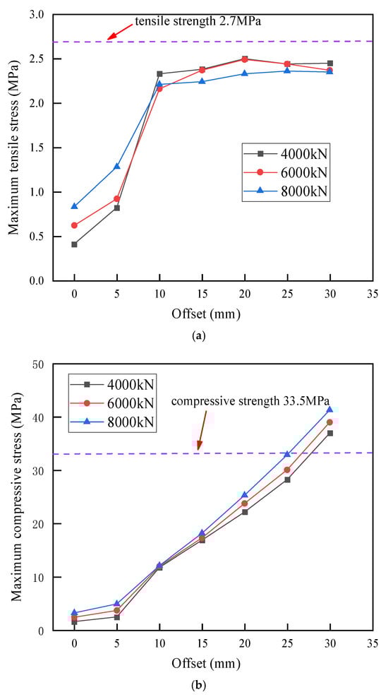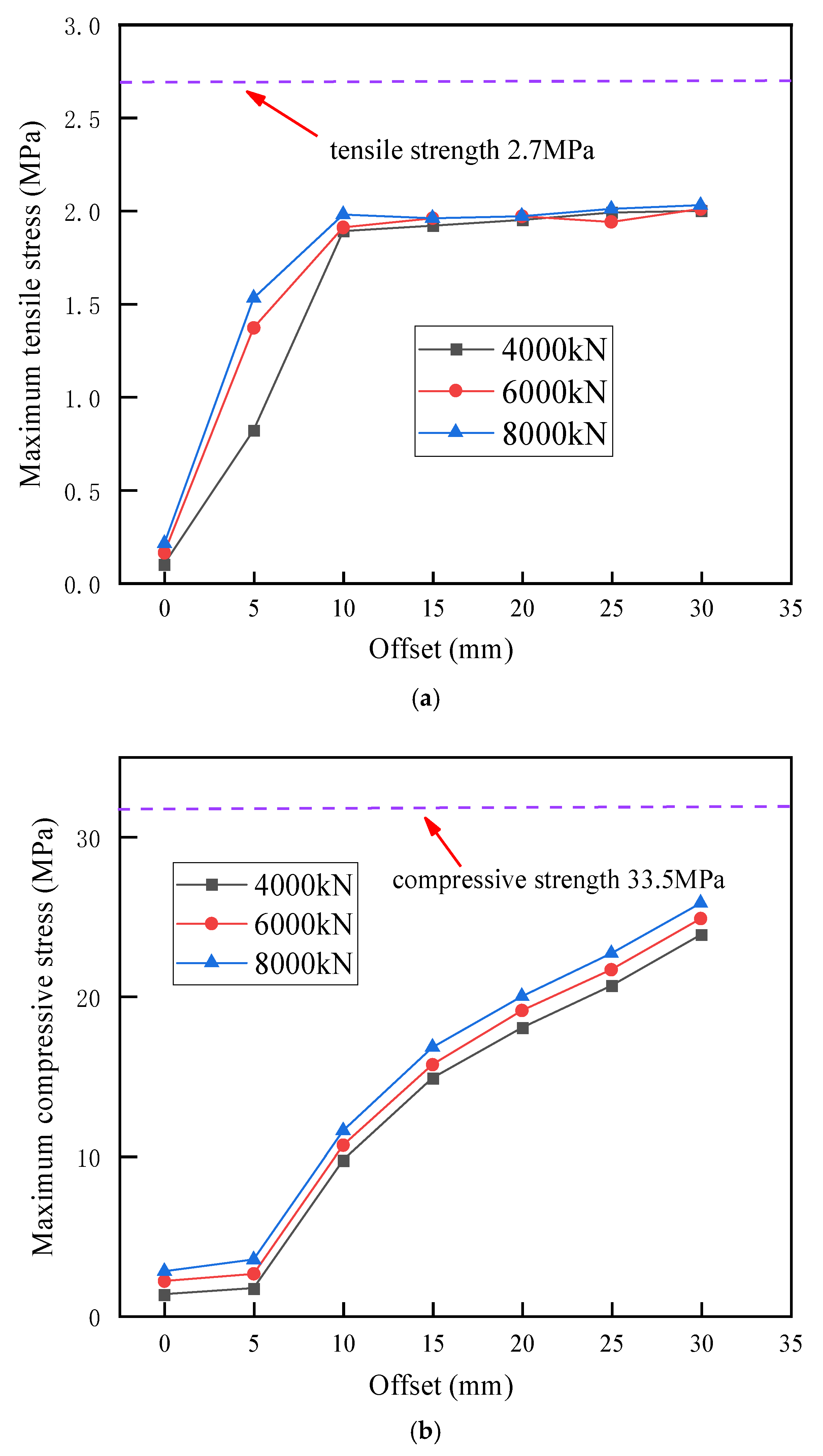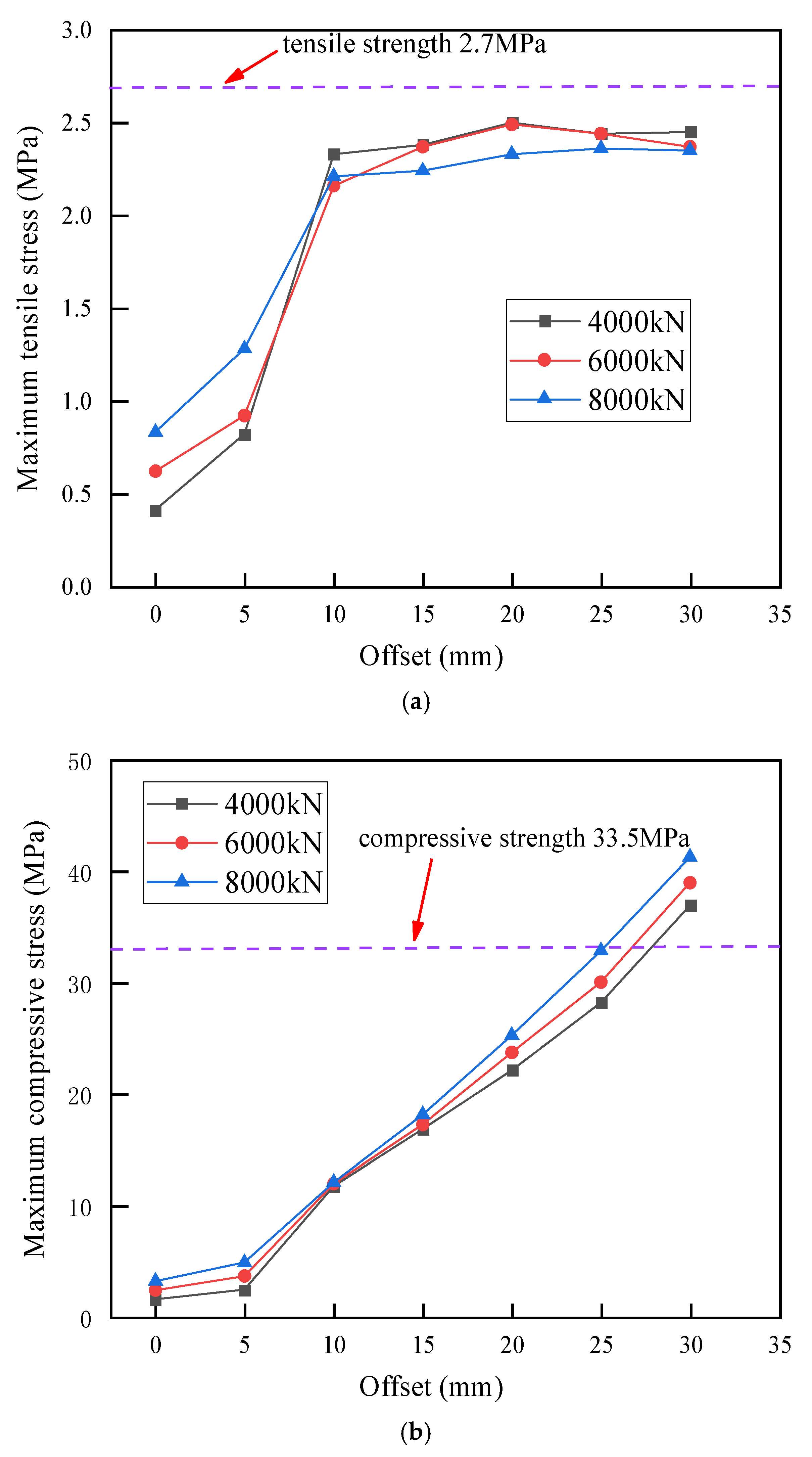 The maximum compressive and tensile stresses of the joint concrete under different jacking forces and joint offsets.