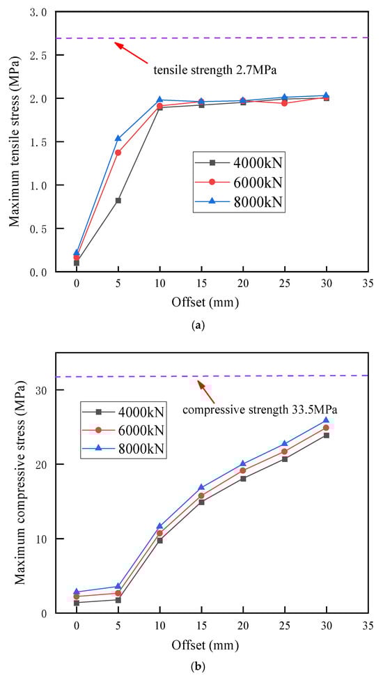 Figure 12b shows that the variation pattern of the maximum compressive stress in the spigot concrete is generally similar to that at the bell end. When the offset does not exceed 10 mm, the maximum compressive stresses under all three jacking forces remain relatively low, not exceeding 3.50 MPa. When the offset is greater than 5 mm, the maximum compressive stress in the spigot concrete exhibits a linear growth trend under all three jacking forces, and the growth rate increases significantly. The compressive stress at the spigot end is considerably lower than that at the bell end. At an offset of 30 mm, the maximum compressive stresses under jacking forces of 4000 kN, 6000 kN, and 8000 kN are 23.88 MPa, 24.89 MPa, and 25.86 MPa, respectively—all remaining below the compressive strength of concrete.
