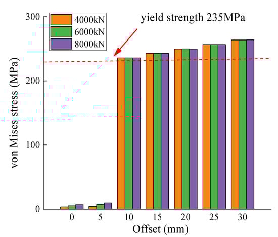 Figure 13 shows the variation of the von Mises stress in the steel ring with respect to offset under three different jacking forces. As illustrated, for the same offset, the von Mises stress in the steel ring remains nearly unchanged as the jacking force increases. This indicates that the magnitude of the jacking force has little effect on the stress state of the steel ring; the increase in steel ring stress is mainly attributed to its resistance to joint shear deformation. When the offset is 10 mm, the overall stress in the steel ring is relatively low under jacking forces of 4000 kN, 6000 kN, and 8000 kN, with the von Mises stress values of 11.61 MPa, 11.70 MPa, and 11.98 MPa, respectively, all remaining below 12 MPa. When the offset increases to 15 mm, the stress in the steel ring begins to grow exponentially, reaching 280.4 MPa, 281.3 MPa, and 281.7 MPa under the three jacking forces—approximately 24 times those at 10 mm offset. At this stage, the von Mises stress exceeds the yield strength of the steel, indicating that the steel ring has yielded. With a further increase in offset, the von Mises stress continues to rise rapidly, reaching a maximum value of approximately 780 MPa at an offset of 25 mm.