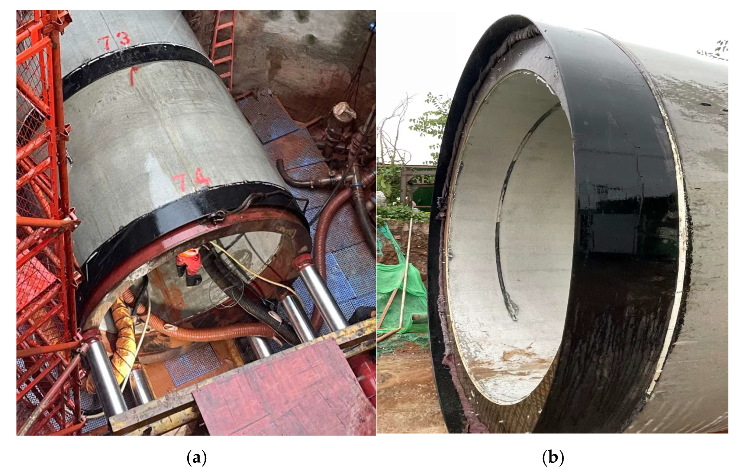 Pipe jacking construction site ((a) Pipe Jacking, (b) Reinforced Concrete Pipe).