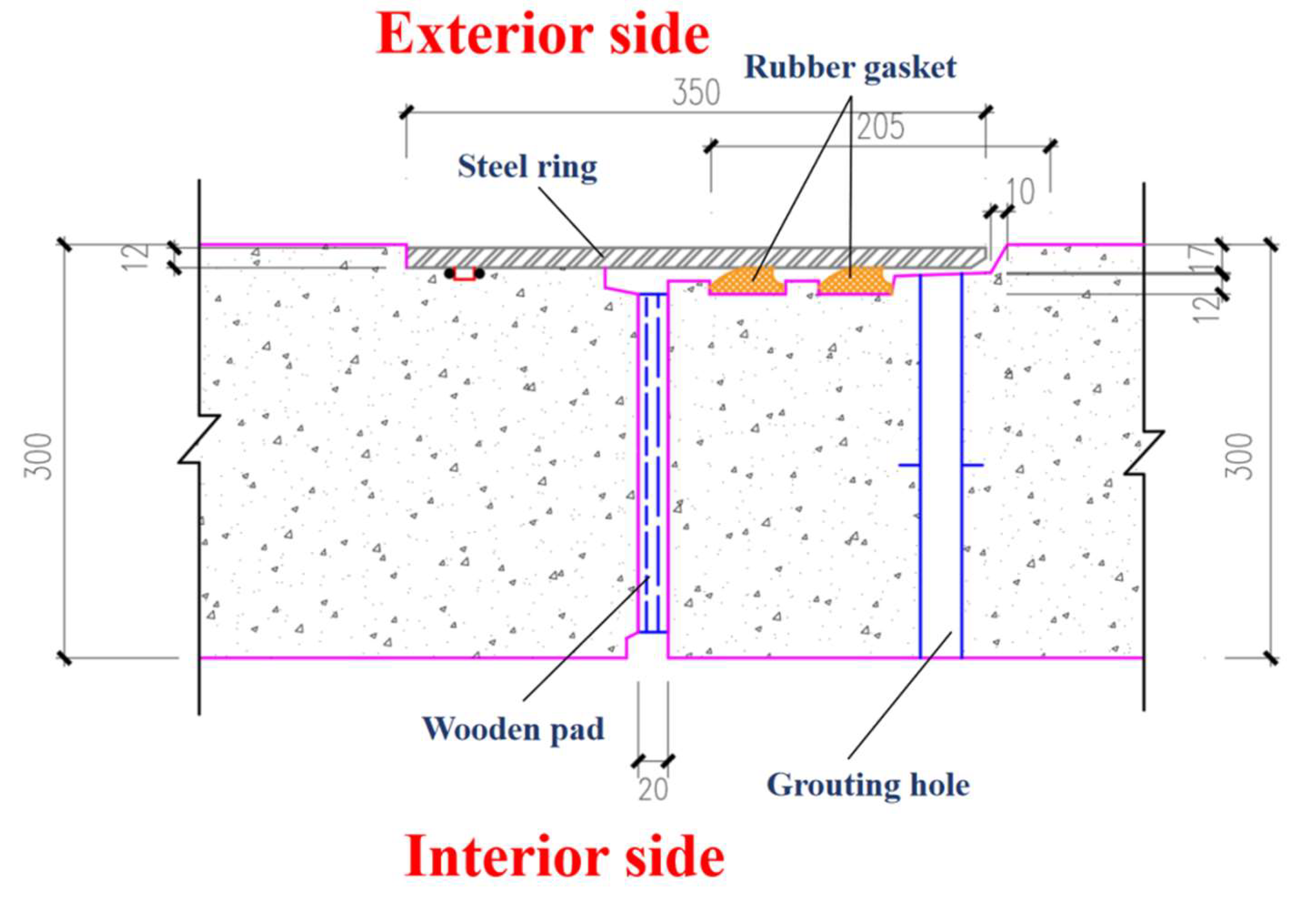 - Xu, Y.; Pei, X.; Dong, W.; Huang, Z.; Kang, J. Waterproof Safety Limit of Rubber Rings of Rectangular Pipe Jacking Tunnel Joints. Tunn. Constr. 2022, 42, 388. [Google Scholar] [CrossRef]