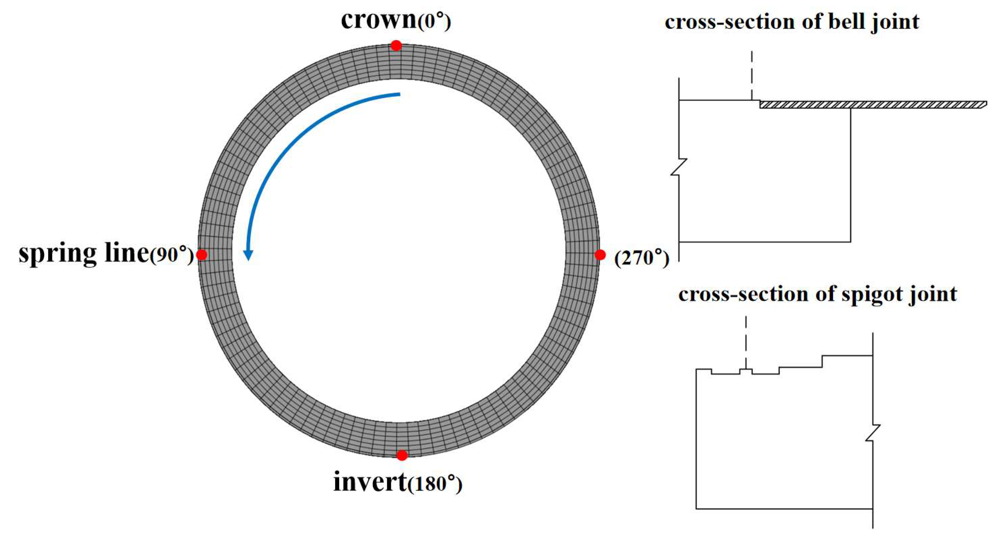 - Becerril García, D.; Moore, I.D. Behaviour of Bell and Spigot Joints in Buried Reinforced Concrete Pipelines. Can. Geotech. J. 2015, 52, 609–625. [Google Scholar] [CrossRef]